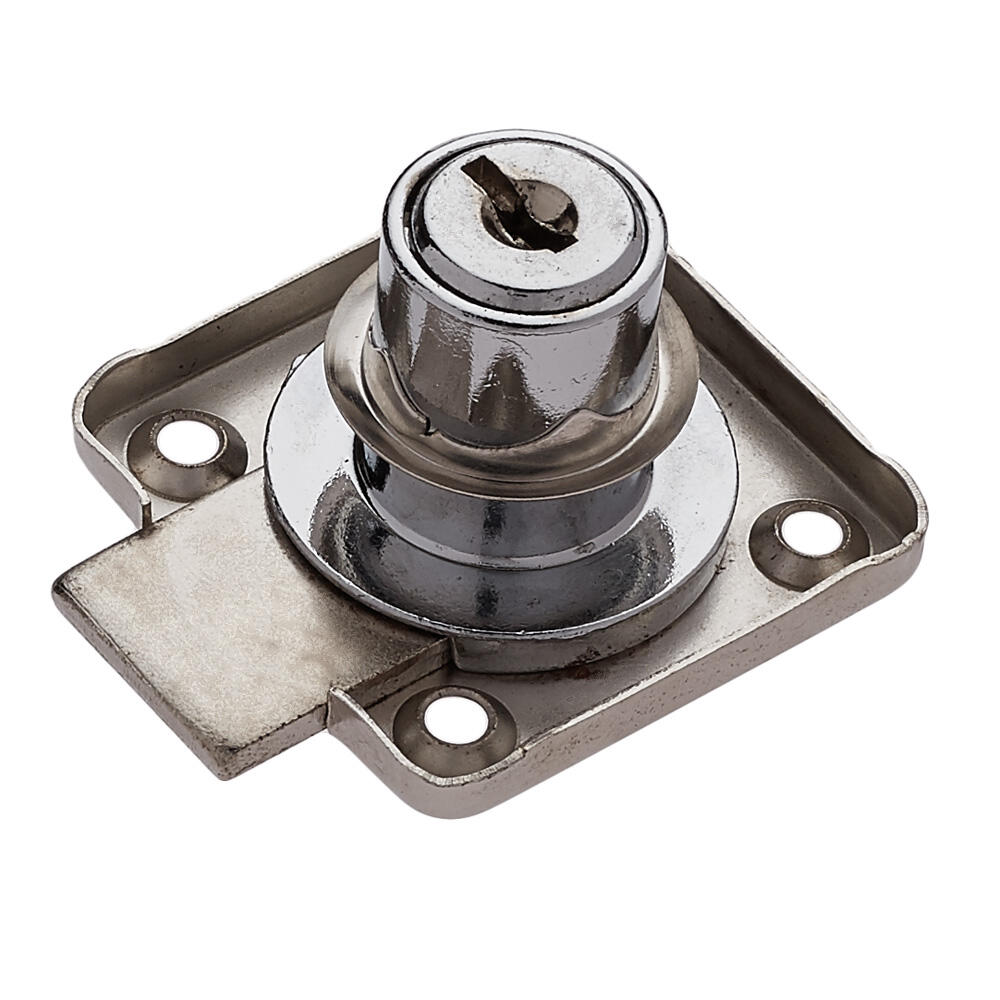 Cerradura de sobreponer de registro para sobreponer. Ideal para armario o cajón. Cilindro de zamack, giro a la derecha. Acabado cromado níquel. Sencillo funcionamiento puesto que el cilindro acciona la palanca con 1 vuelta y bloquea la cajonera. Instalación sencilla mediante tirafondos Contiene: 1 cerradura, 1 cerradero, 1 escudo embellecedor, 2 llaves. Llaves iguales