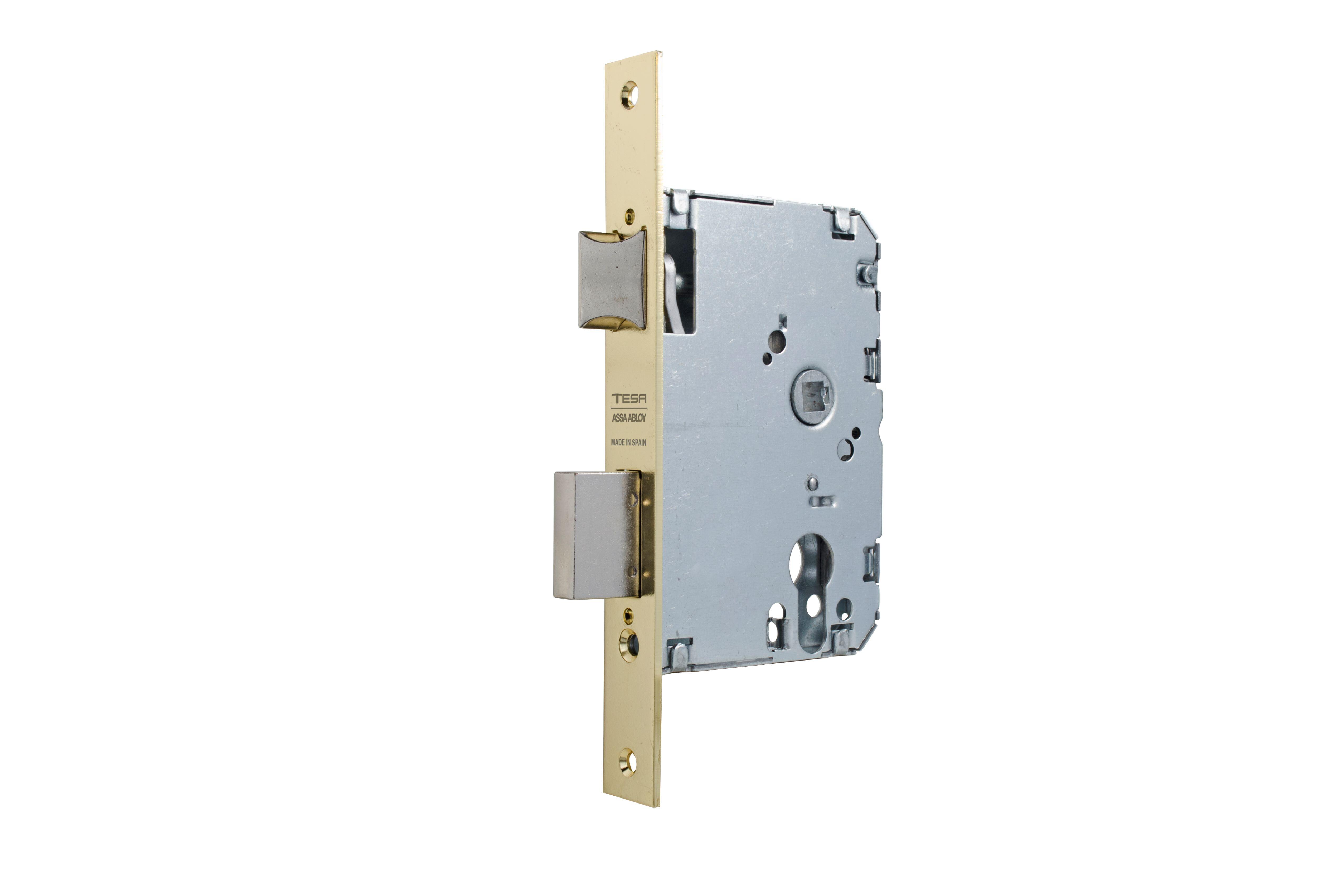 Cerradura para puertas de madera 2010P, sin cilindro, entrada de 50mm, acabado hierro latonado
