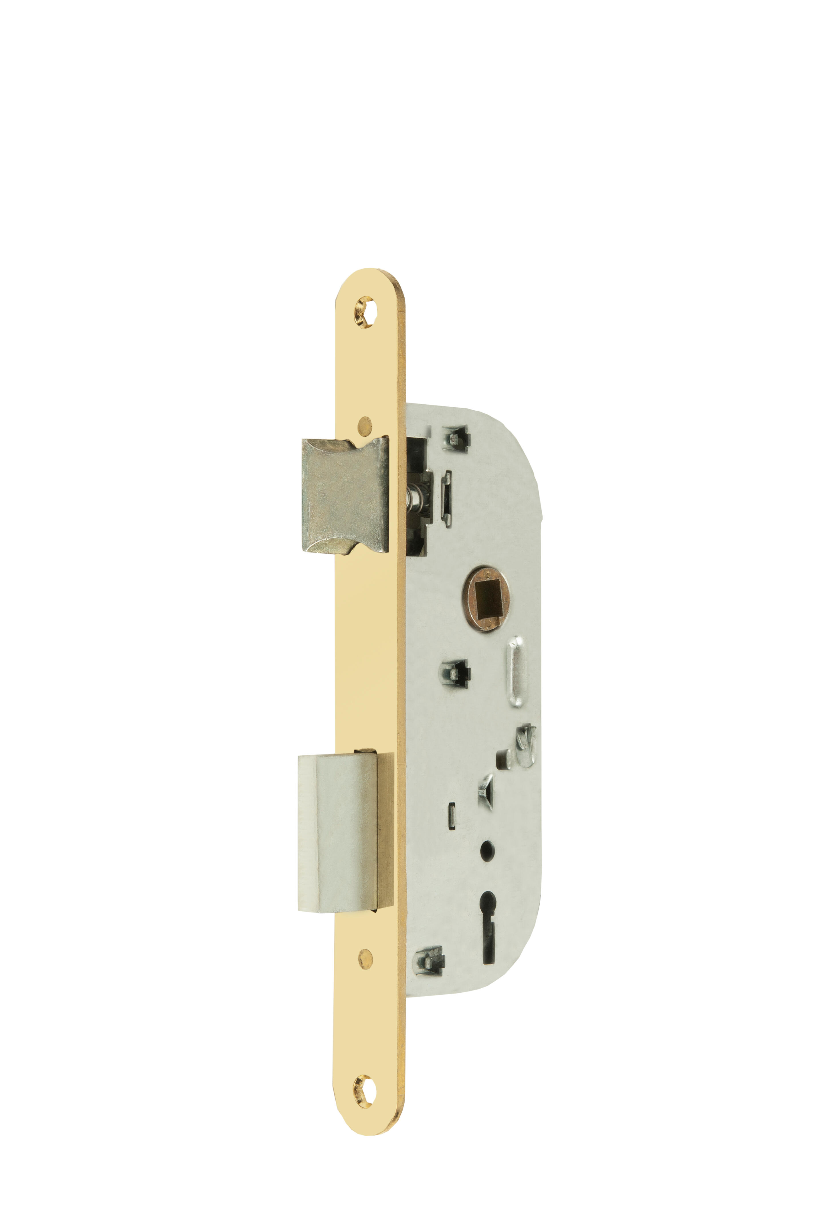 Cerradura de embutir para puertas de madera, entrada 35 mm. Distancia entre ejes de 70 mm. Cerradura con picaporte y palanca rectangular con 1 llave de borja. Picaporte reversible y accionable mediante manilla o llave. Acabado latonado