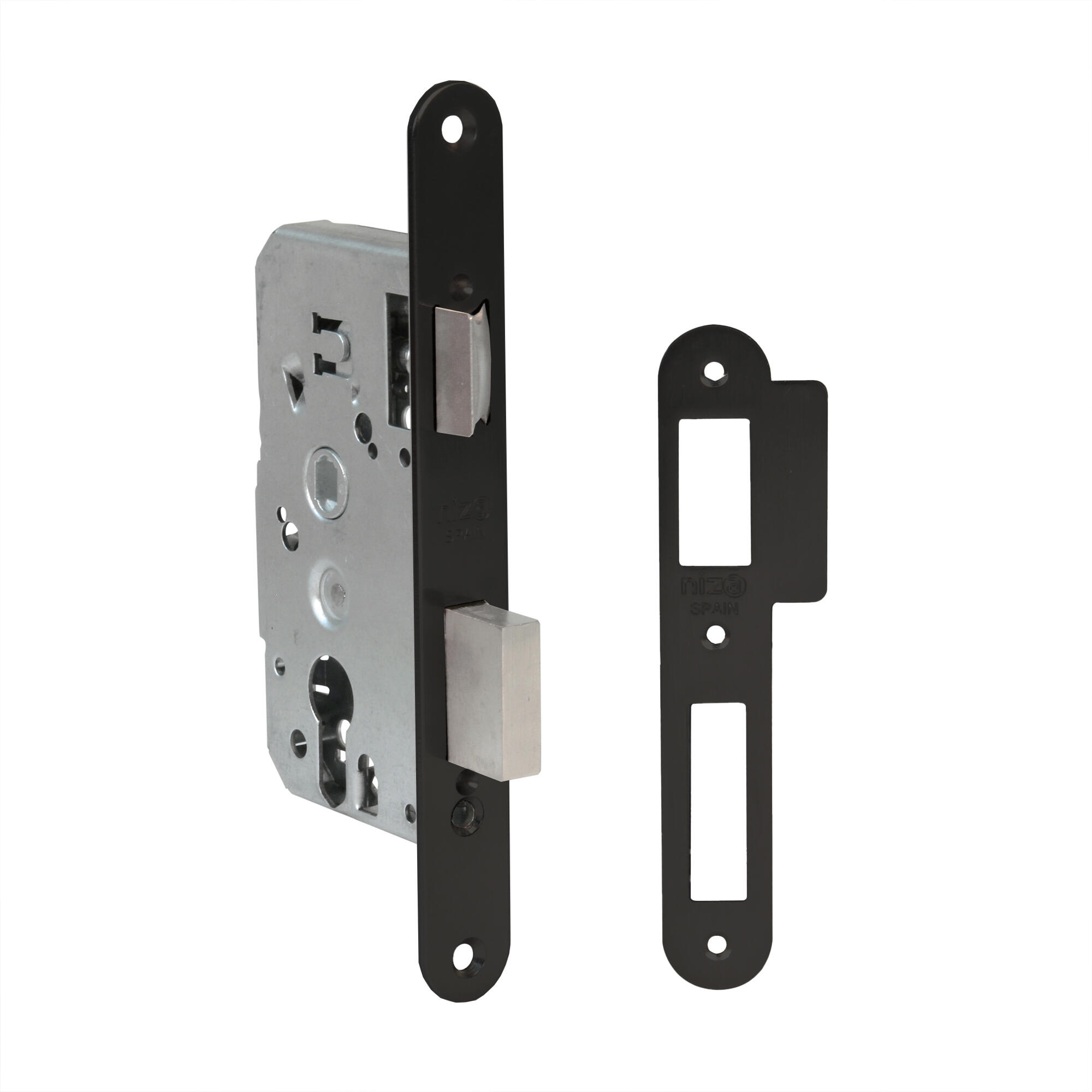 Cerradura de embutir para puertas de madera con paletón de cierre. Canto redondo. Frente y soporte en acero. Picaporte reversible. Distancia entre nueca de manilla y alojamiento de cilindro europerfil: 47 mm. Entrada: 40 mm. Nueca para manilla de 8 mm. Sin cilindro ni bocallave. Acabado negro