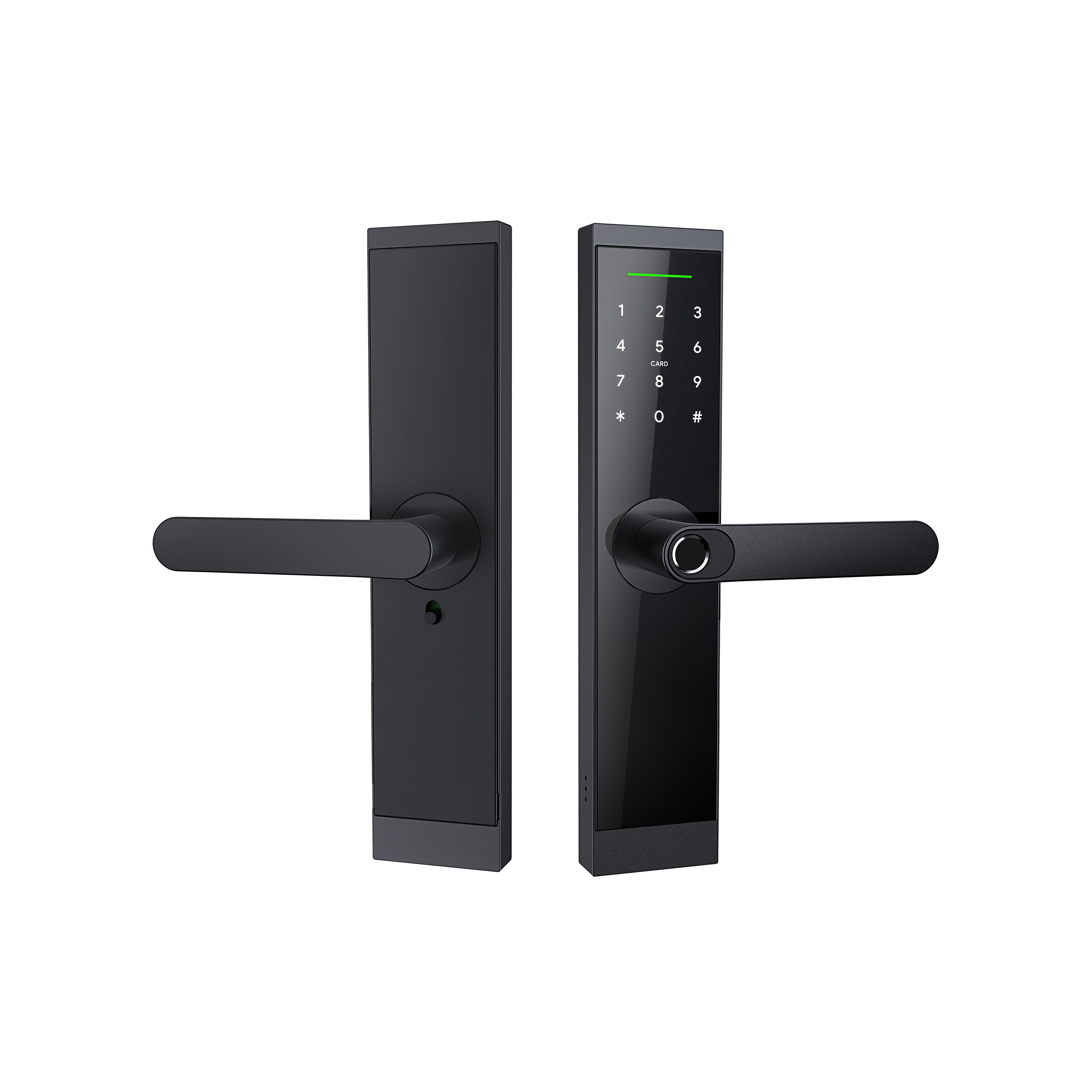 Cerradura manilla con placa en color negro, con posibilidad de apertura a través de huella dactilar, teclado numérico, smarthphone a traves de app Amazón Alexa y google y tarjeta. Valido para puertas de madera o metálicas. Sistema apertura emergencia a través de llave mecánica y usb