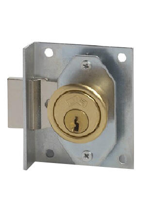 Cerradura de pestillo. No reversible. Mano derecha o izquierda. Caja y pestillo de hierro, cilindro y escudo de latón pulido. Incluye 2 llaves de alpaca.