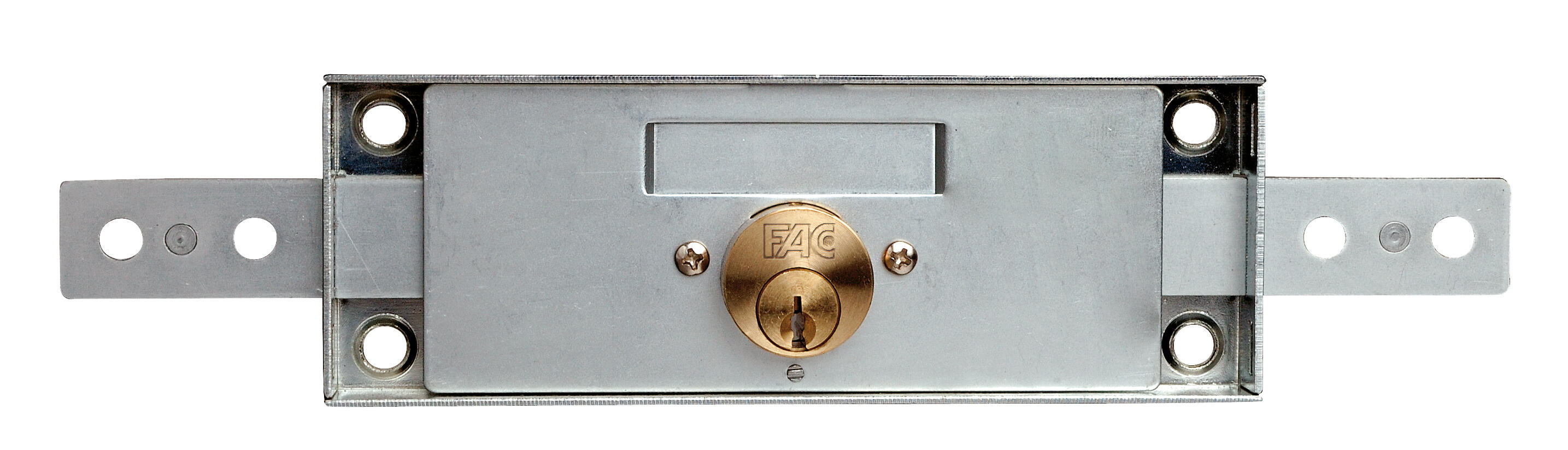 Cerradura para persiana plana acabado cincado de 157 x 55 mm. Cilindro de vuelta sencilla con 2 llaves