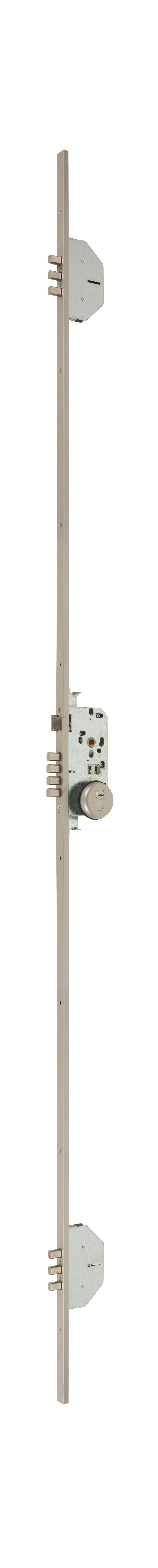 Cerradura de seguridad multipuntos con 3 puntos de cierre horizontales. Cerradura central de 4 bulones. Escudo abierto. Incluye cilindro