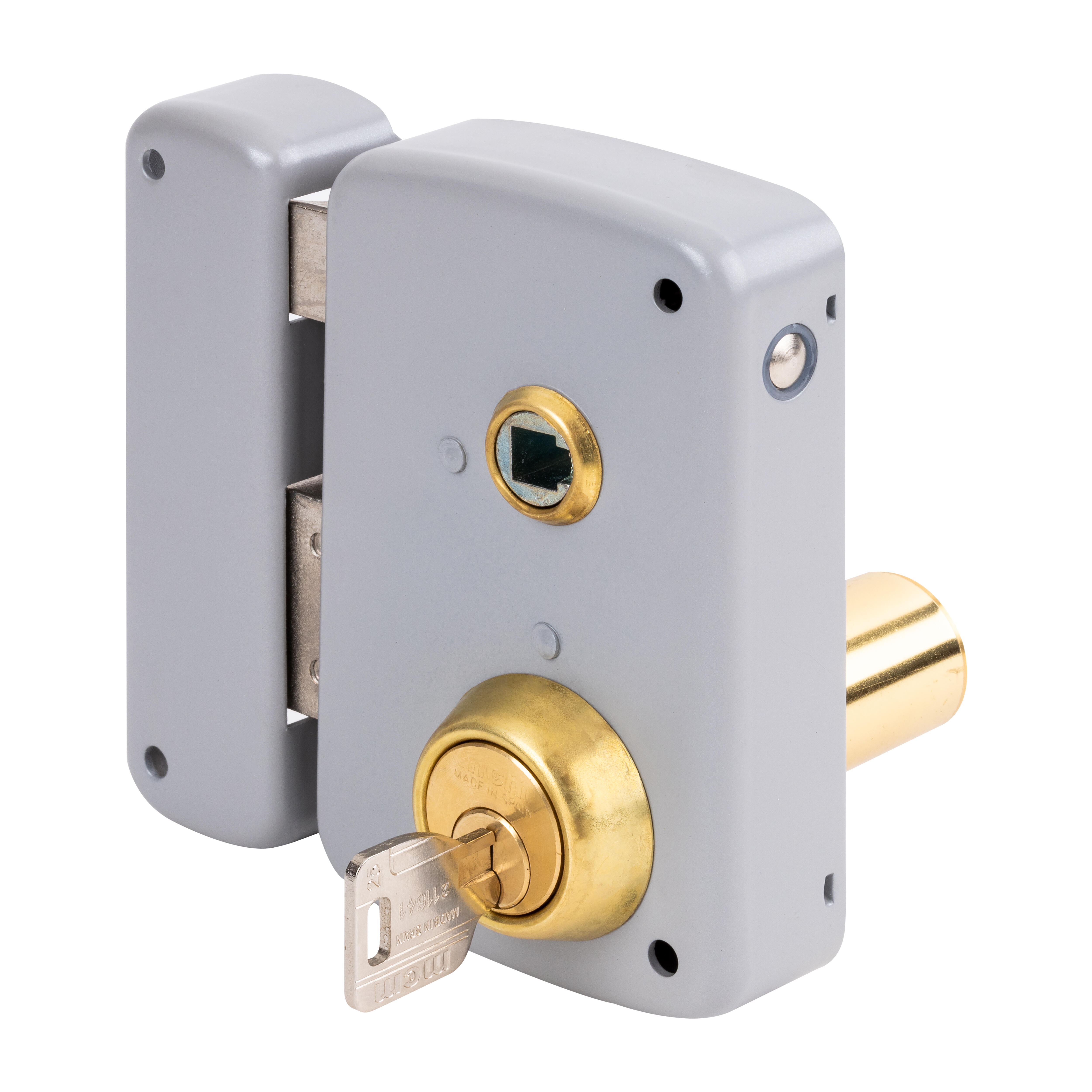 Cerradura de sobreponer con palanca y picaporte, con cilindro por ambos lados. Picaporte no reversible, la cerradura guarda mano, accionado mediante manilla por ambos lados. Cilindro por lado interior de latón redondo. Se suministra con 3 llaves de serreta. Acabado pintado gris.