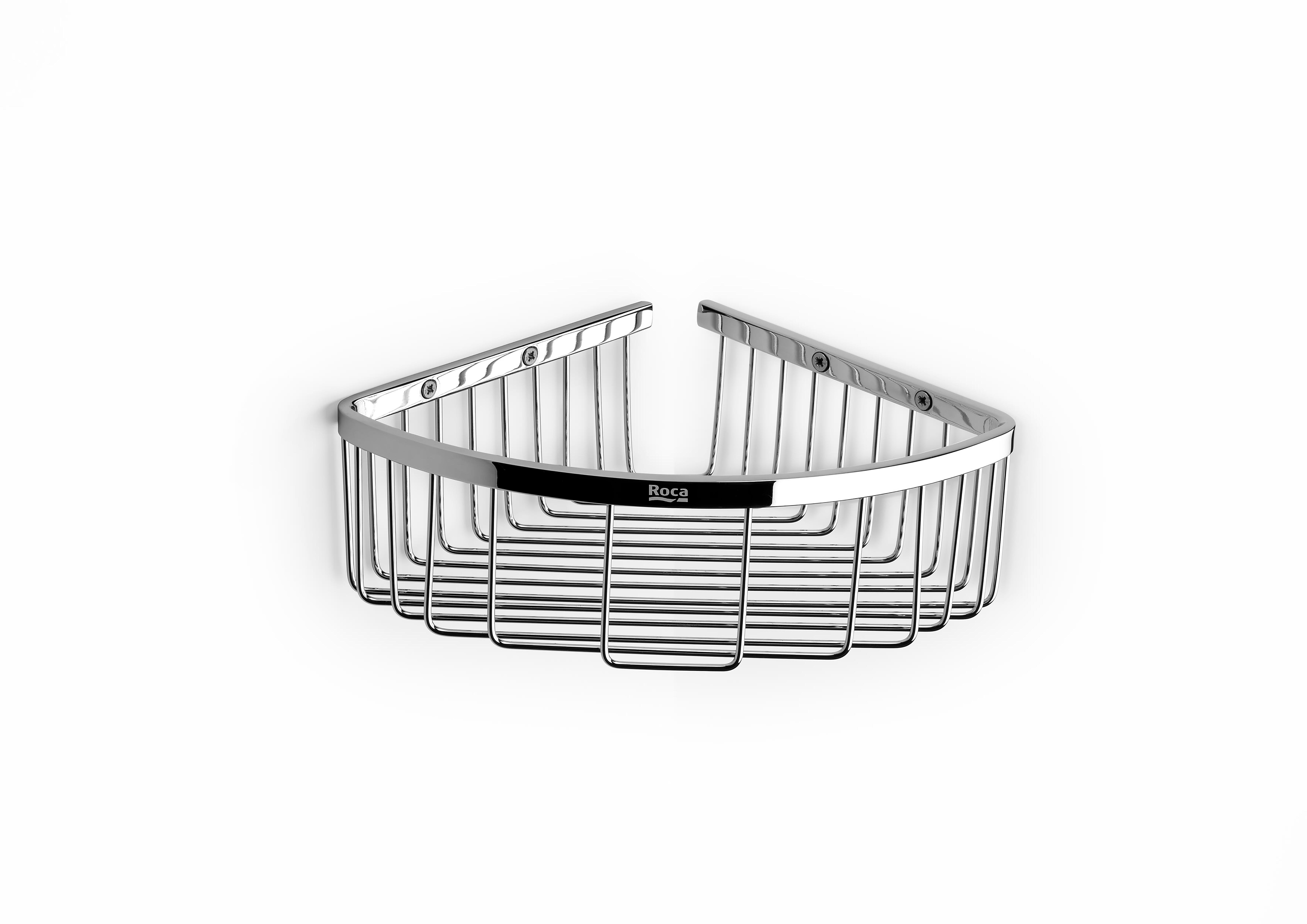 Cestillo de rincón para baño, fabricado en metal, acabado cromo brillante. De instalación en pared, en esquina.