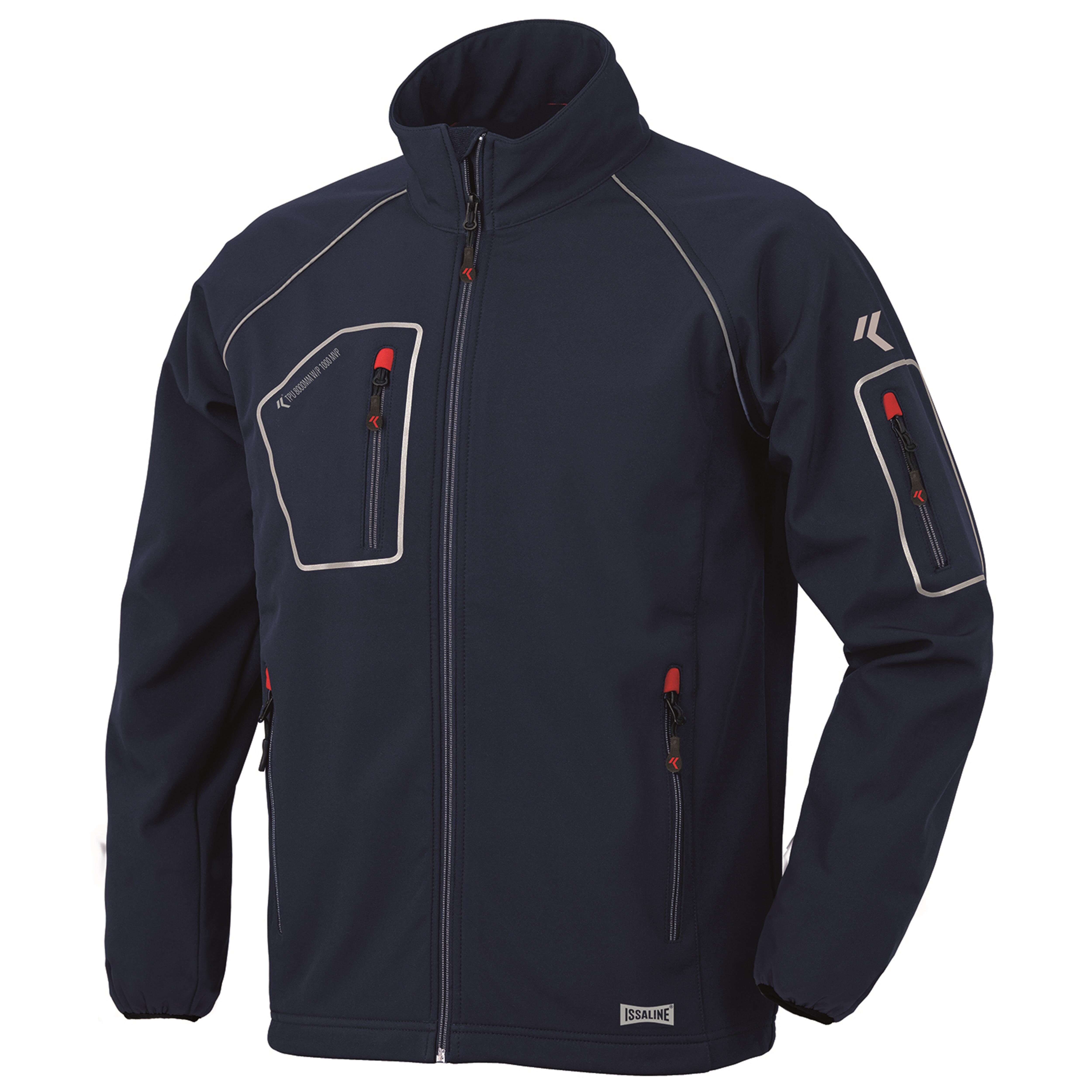 Chaqueta soft shell azul talla L ISSA 04515NB Just. Cierre central con cremallera. Tejido especialmente suave y al mismo tiempo técnico. Equipada con inserciones de ribete de alta visibilidad y un práctico portallaves tipo roller.