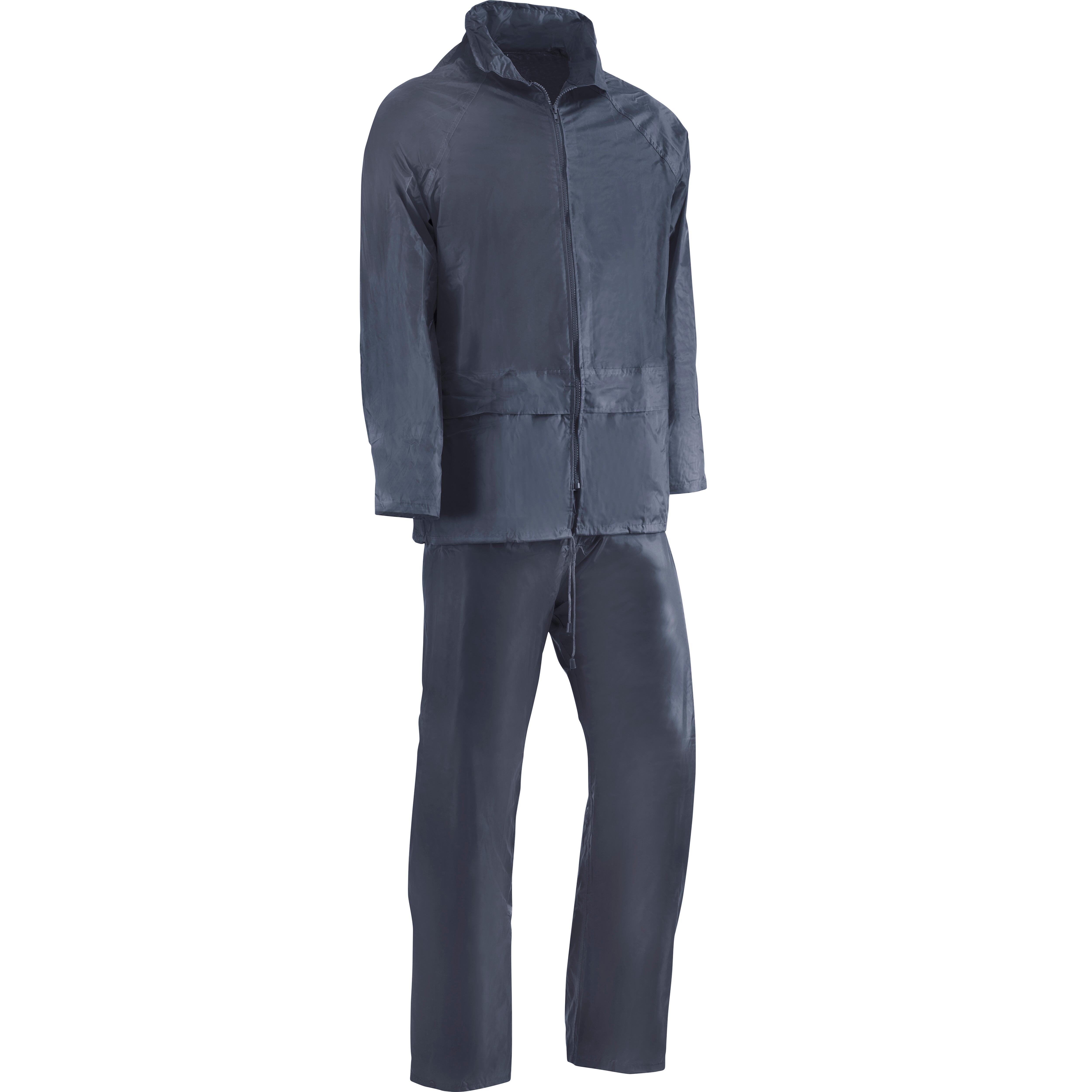 Chubasquero 2 piezas transpirable azul talla L Velilla Iguazú. Chaqueta con capucha fija interna con cierre de cremallera. Puño elástico en el interior de la manga. Pantalón con cintura elástica y bolsillos abiertos.