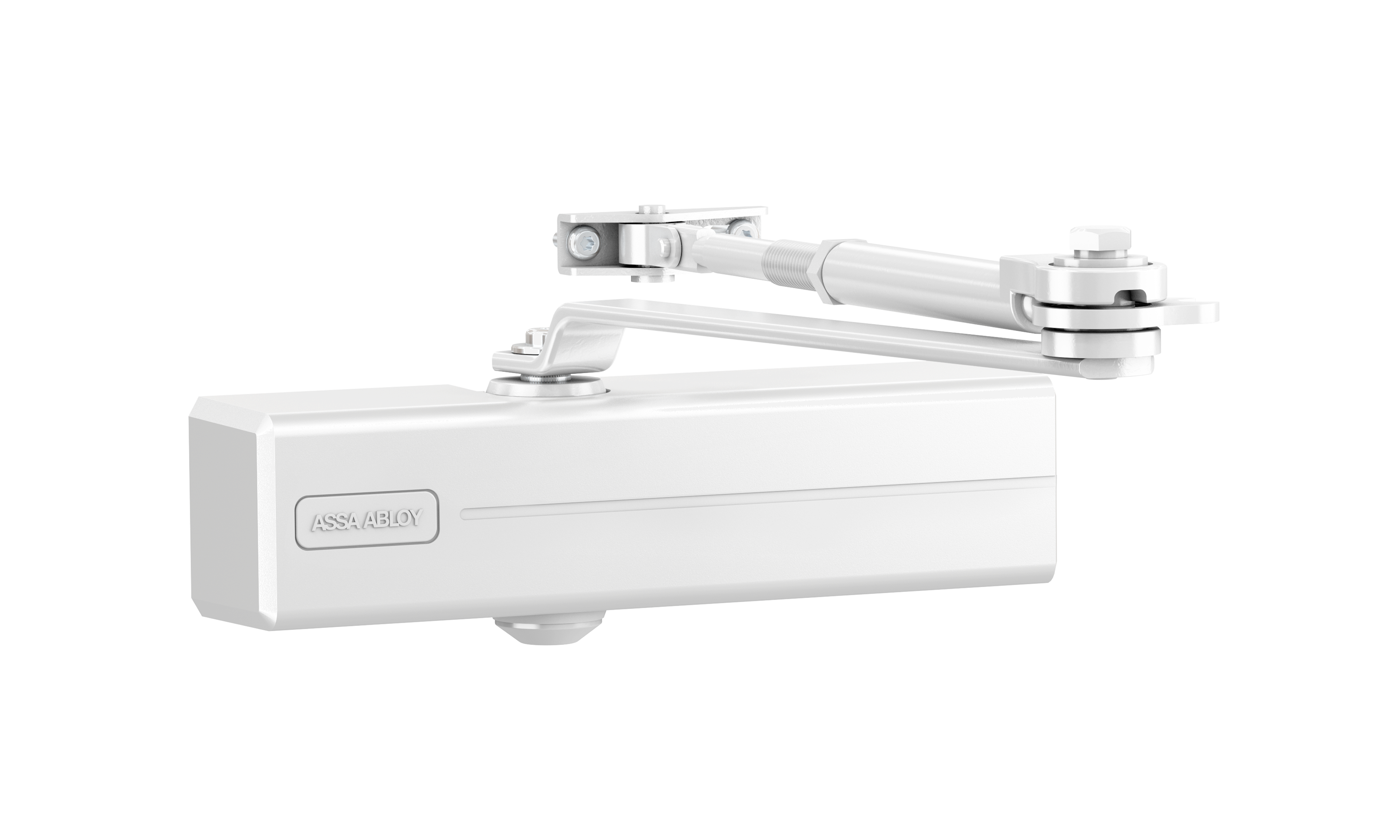 Cierrapuerta con brazo retenedor en color blanco. Se puede utilizar en puertas de mano izquierda y derecha. ∙ Las velocidades de cierre y golpe final se pueden regular de forma independiente ∙ Las válvulas metálicas hacen que los ajustes sean fiables ∙ Rendimiento constante en una amplia gama de temperaturas ∙ La función de freno a la apertura es estándar para proteger el marco y las áreas circundantes ∙ Carcasa de plástico pintado diseño ASSA ABLOY con etiqueta con logo reversible incluida.