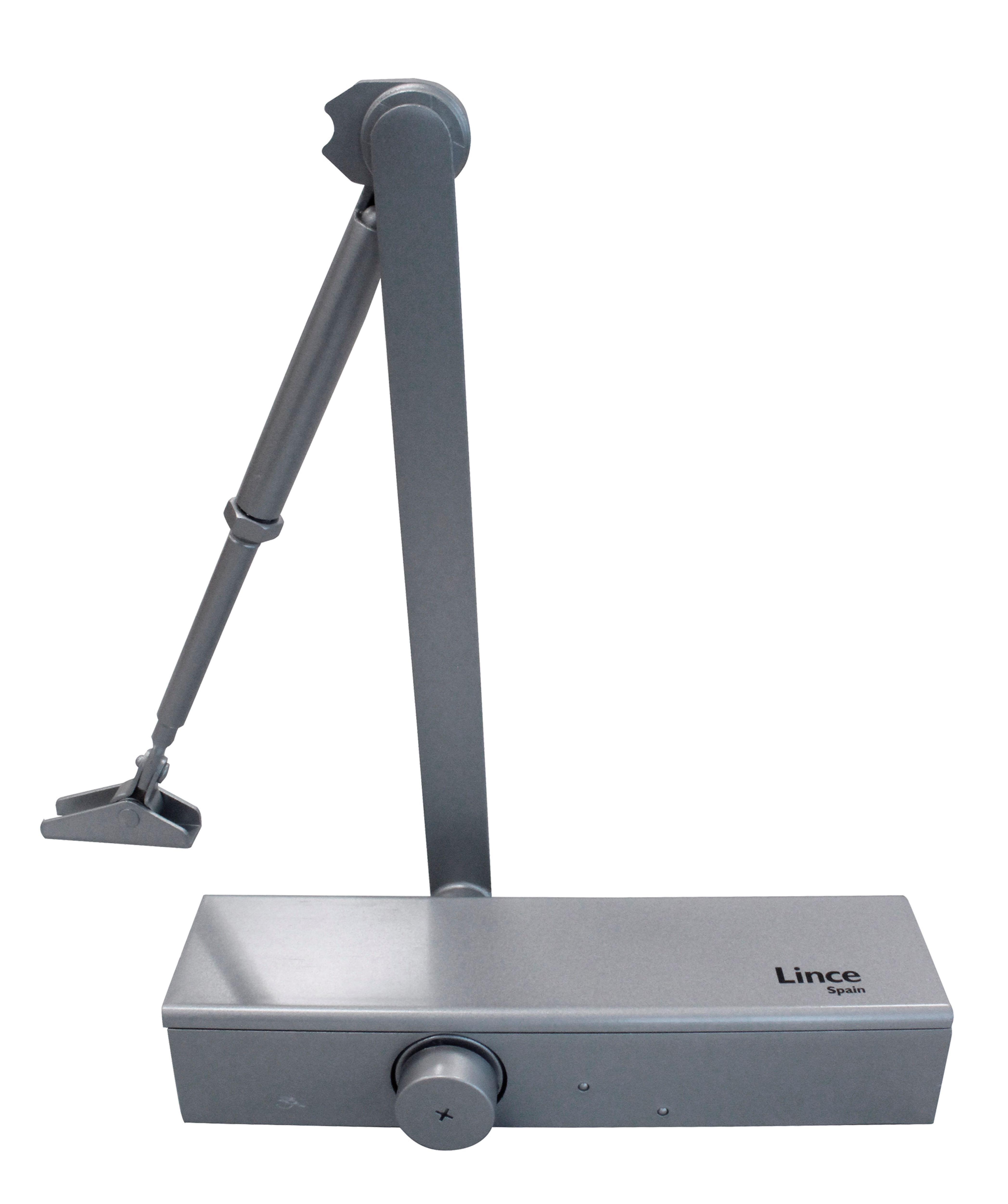 Cierrapuertas básico de piñon cremallera con brazo articulado con retenedor. Certificado según UNE-EN1154. No guarda mano. Aplicación en puertas de hasta 1250mm de ancho y peso de 20 a 100kg.