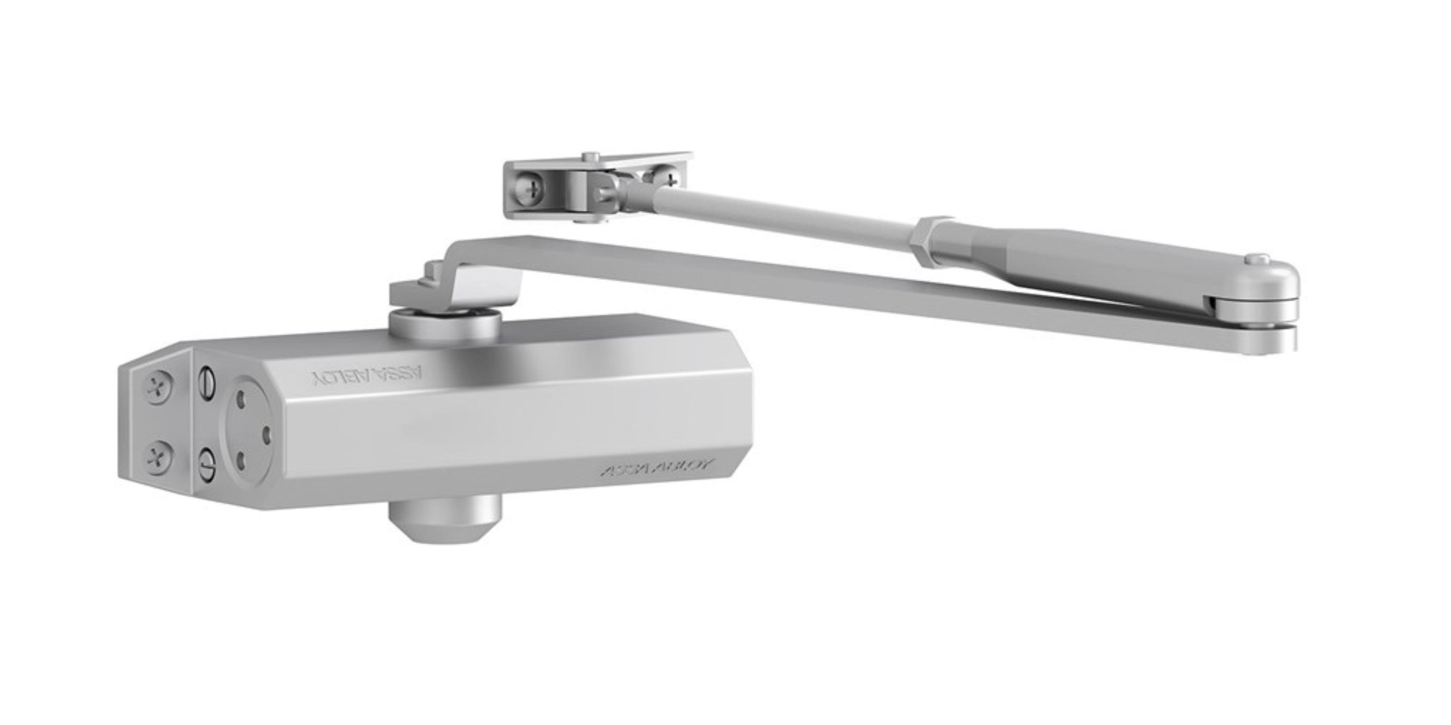 Cierrapuertas de piñón-cremallera con brazo articulado para puertas de una sola hoja, tamaño 2/3/4. Solución económica y compacta para una amplia gama de aplicaciones. El DC110 viene completo con cuerpo y brazo. Certificado según EN 1154, tamaño 2/3/4 (tamaño 3 con brazo paralelo) ∙ Adecuado para puertas cortafuegos y corta humo. Para puertas de una hoja de hasta 1100 mm de ancho. Color plata.