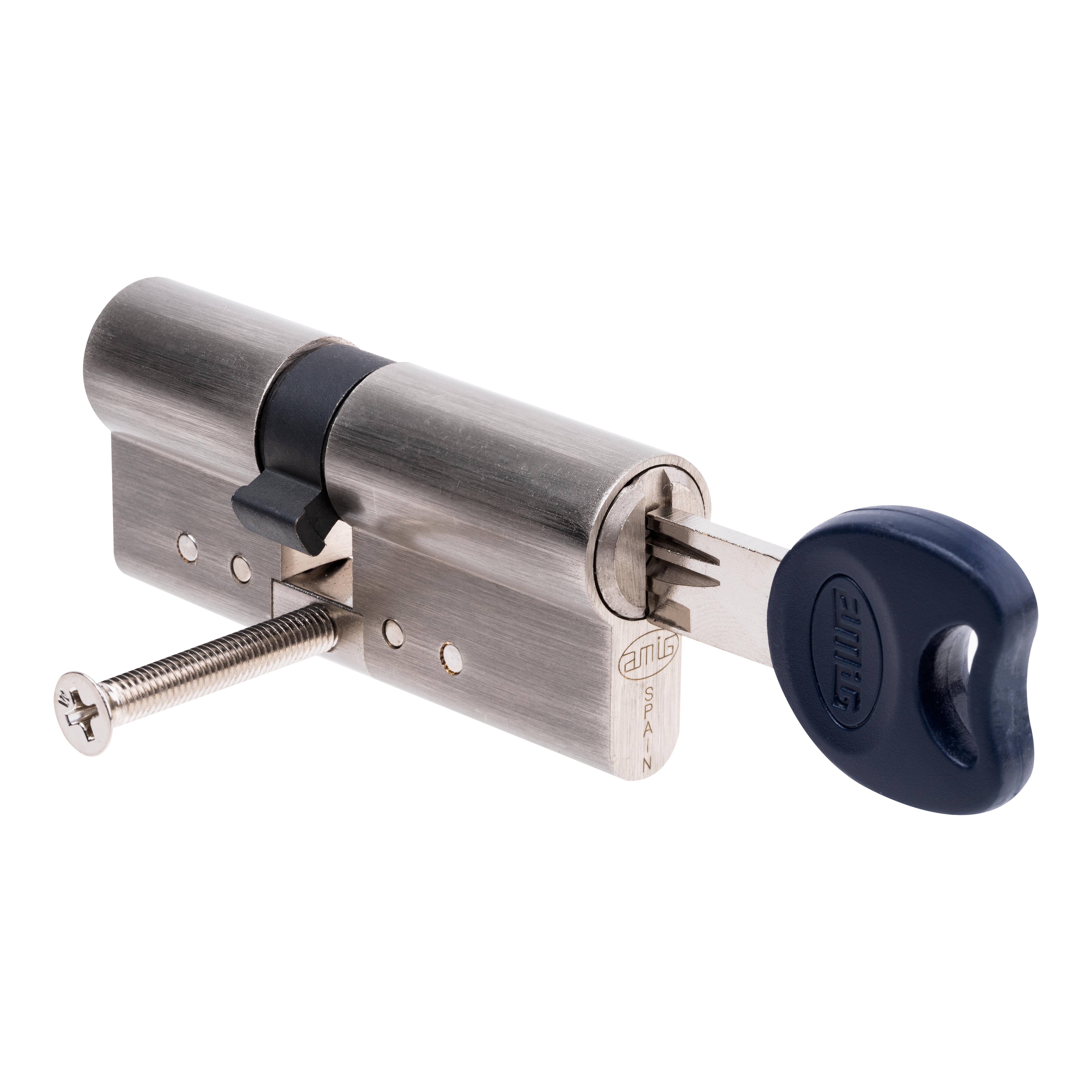 Cilindro de alta seguridad en latón con acabado cromado mate. Tiene 6 pines, leva de 13,2 mm, doble embrague, 1 pin anti taladro en el cuerpo y 2 en el rotor. Barra anti extracción y anti rotura de acero inoxidable. Protegido contra ganzúa. Sistema antibumping. Muelles de acero inoxidable. Cilindro codificado con tarjeta de propiedad para la copia de llaves. Incluye 5 llaves con cabeza plástica. Uso en cerraduras para carpintería metálica.
