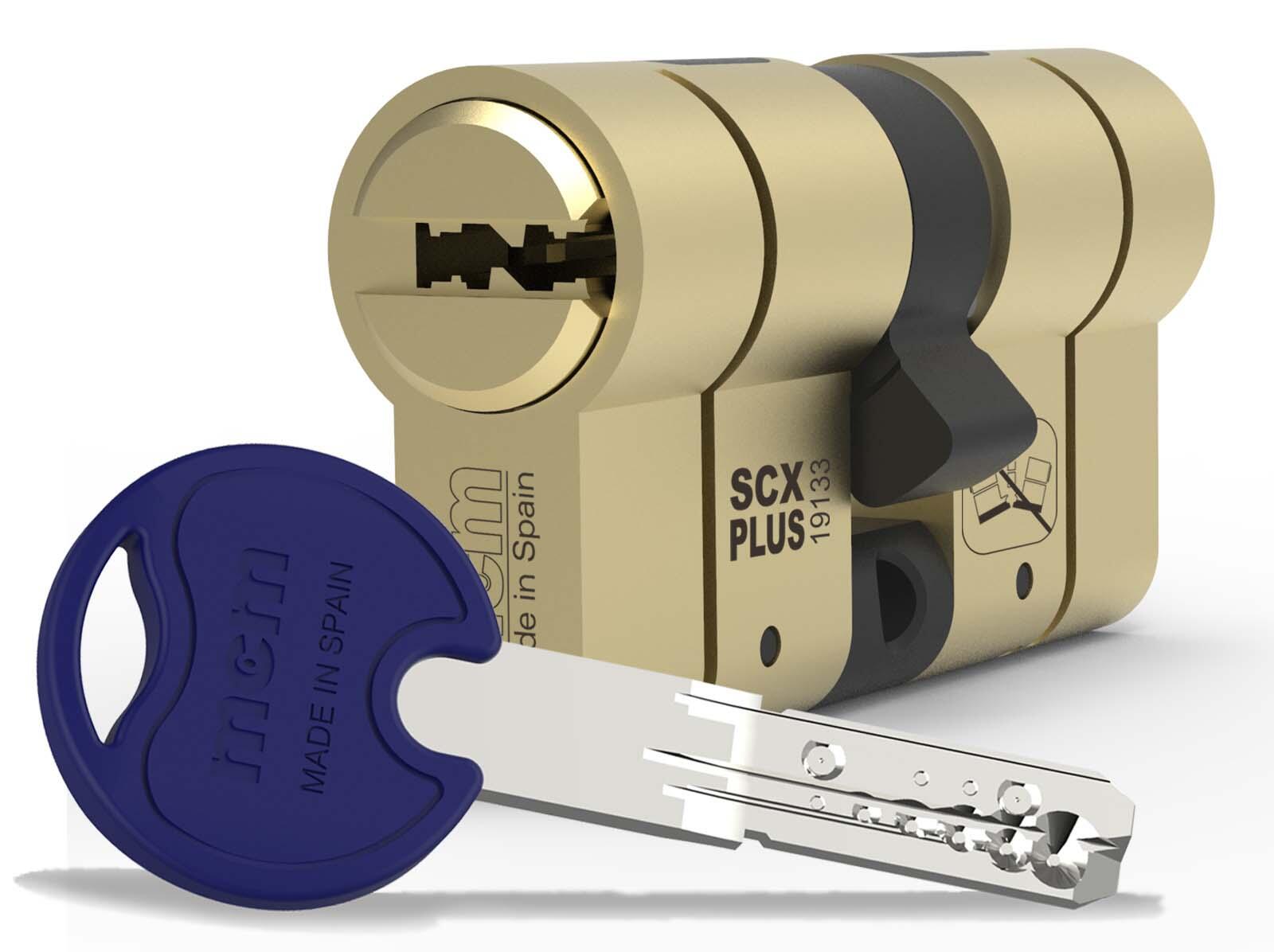 Cilindro de seguridad anti-rotura, con barra de acero. Antibumping y anti ganzúa. Sistema de rotura programada. Llave con doble fila de pitones modelo Soft Key (cabeza ancha con cuello largo) Cilindro de latón tipo Euro-perfil.
