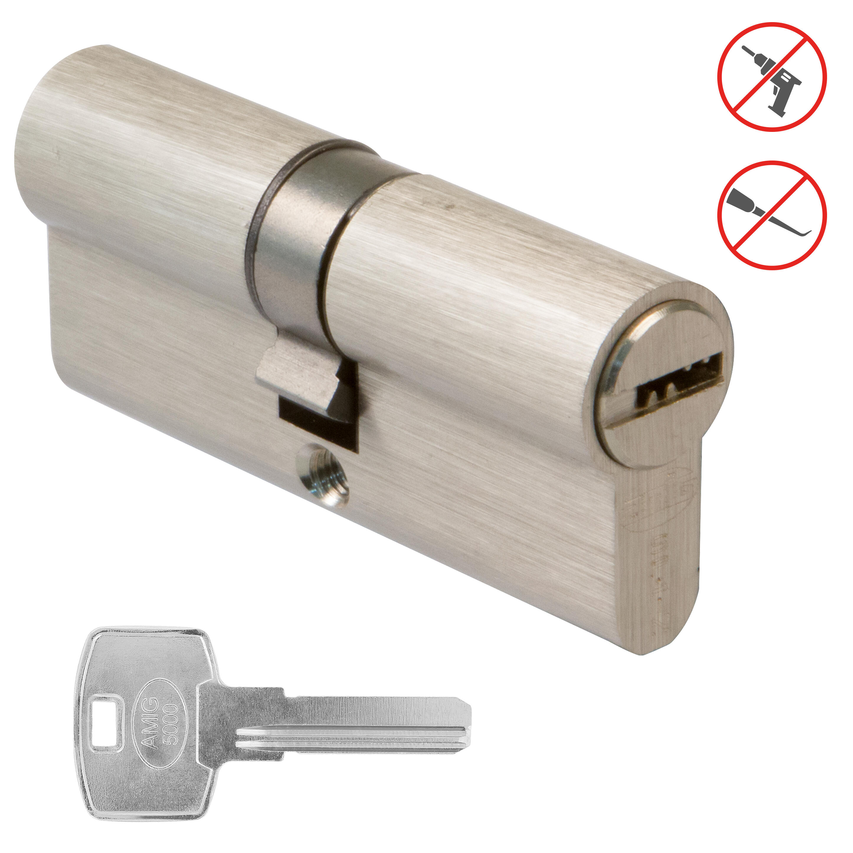 Cilindro de seguridad en latón. 6 pines y leva de 15 mm. Sistema antitaladro. Muelles de acero inoxidable. Incluye tornillo de 60 mm. Incluye 5 llaves de punto de latón. Llave en bruto modelo 5000. Acabado cromado