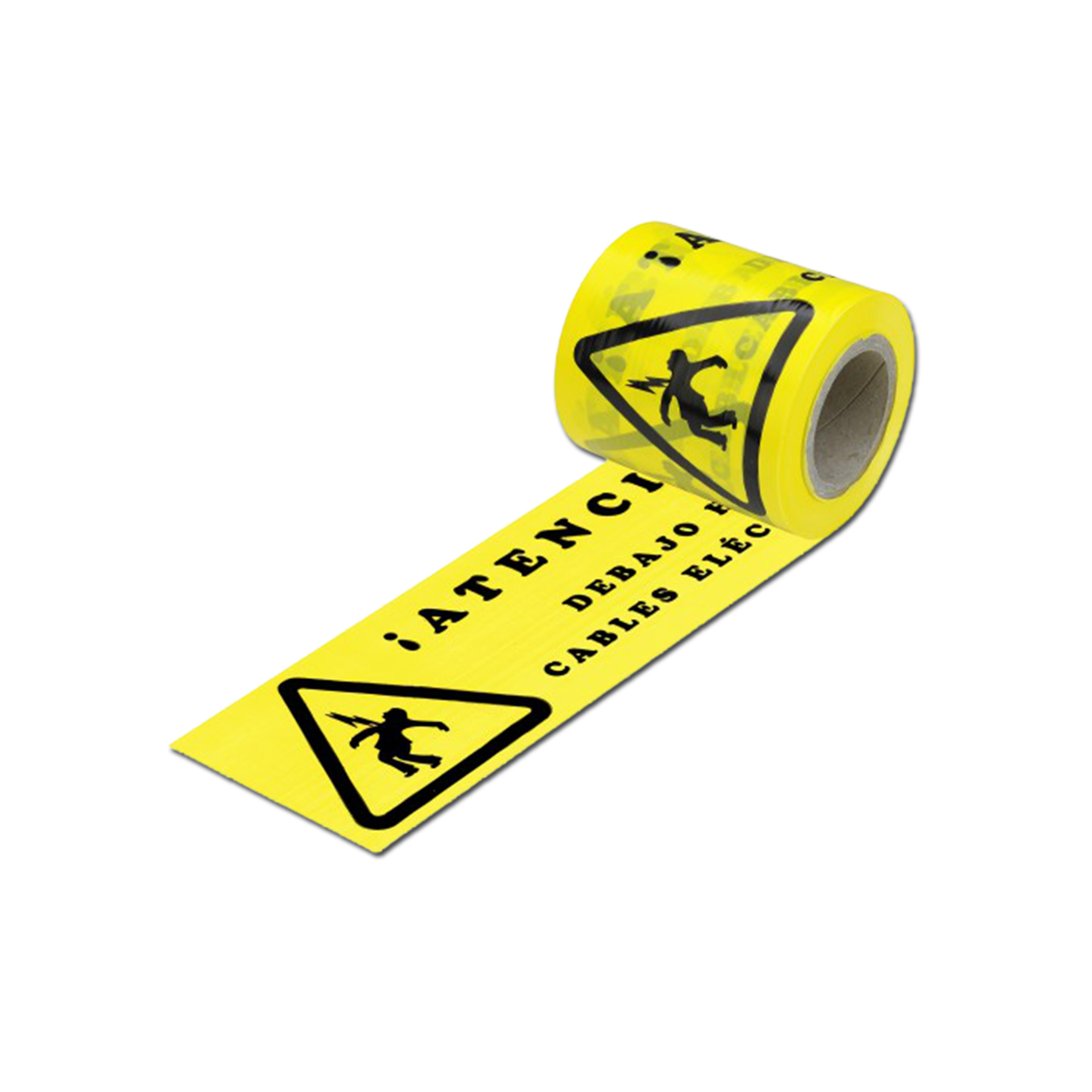 Cinta de marcaje de seguridad para instalación bajo el terreno en las líneas de las conducciones eléctricas, de 15 cm de ancho y 250 metros., en fondo de color amarillo y rotulada en color negro con pictograma y texto: ¡Atención! Debajo hay cables eléctricos.