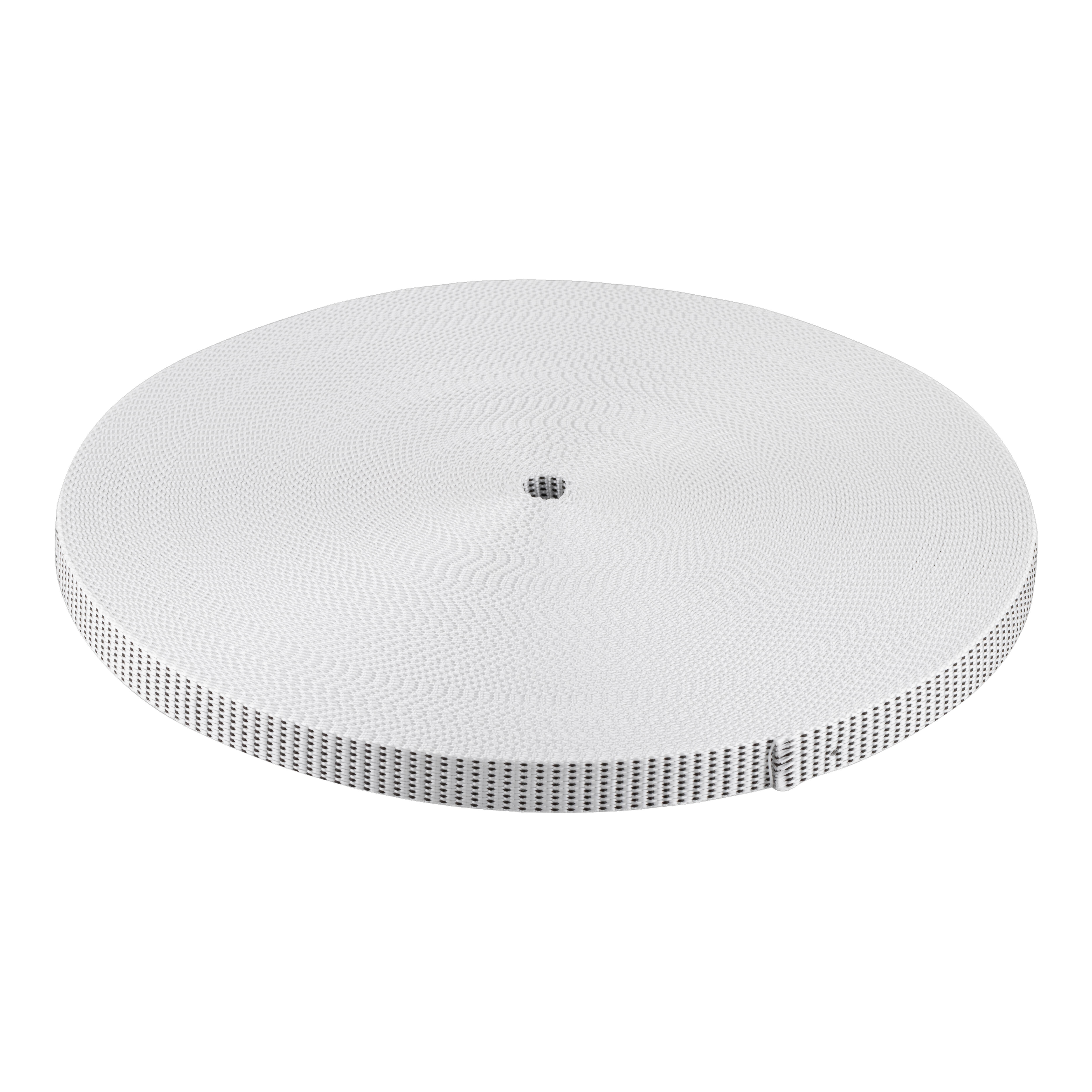 Cinta para persiana en color blanco con pintas negras de 18 mm de ancho y una longitud total de 50 metros realizada en nailon