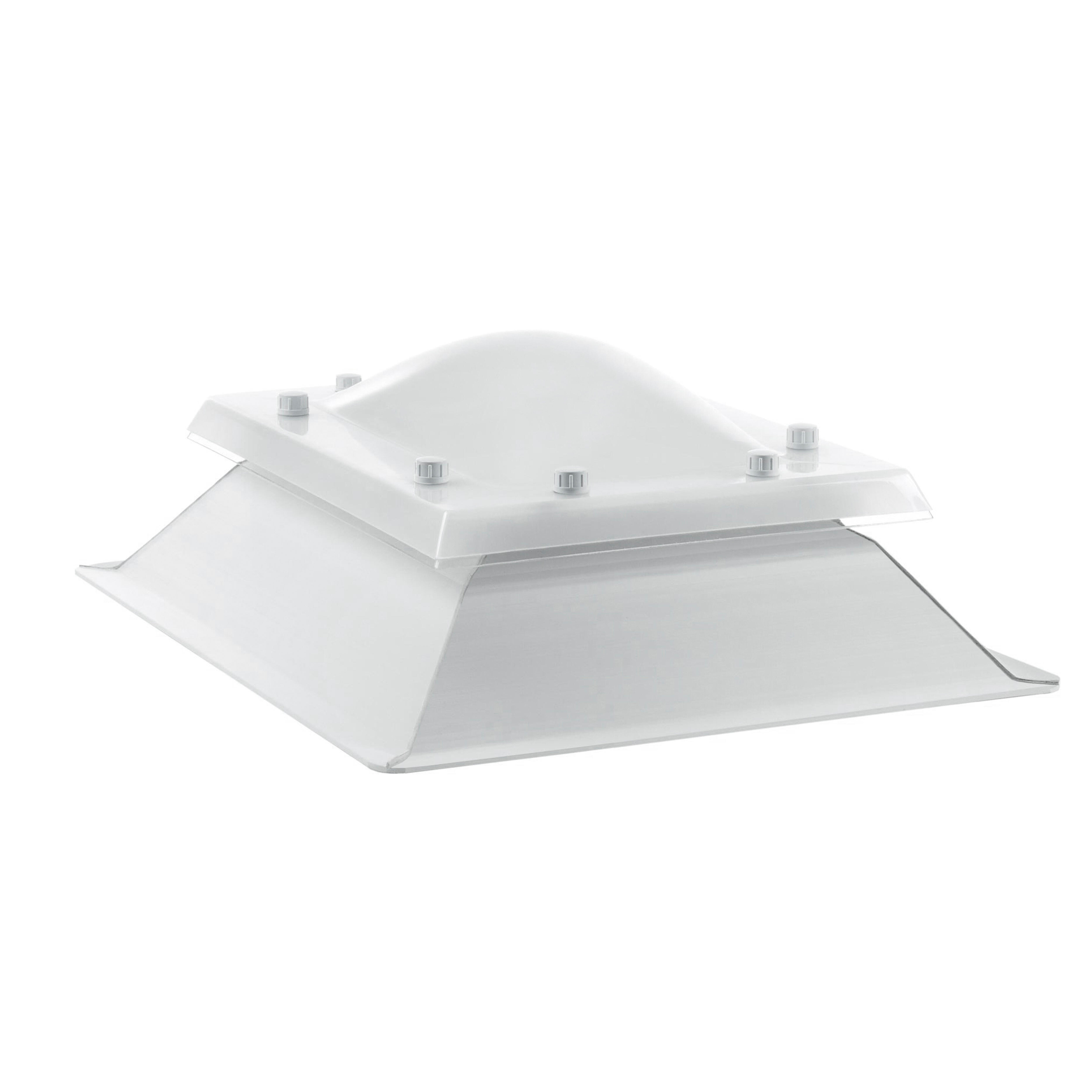 Claraboya compuesta por zócalo de PVC y cúpula de polimetilmetacrilato sin sistema de apertura. Permite la entrada de luz natural con el consiguiente ahorro energético, se utiliza como sistema de iluminación natural. Reflejan la energía solar reduciendo hasta un 50% el calor en el interior del recinto gracias a su recubrimiento. Especialmente indicada para cubierta plana. No sellar con silicona las cúpulas.