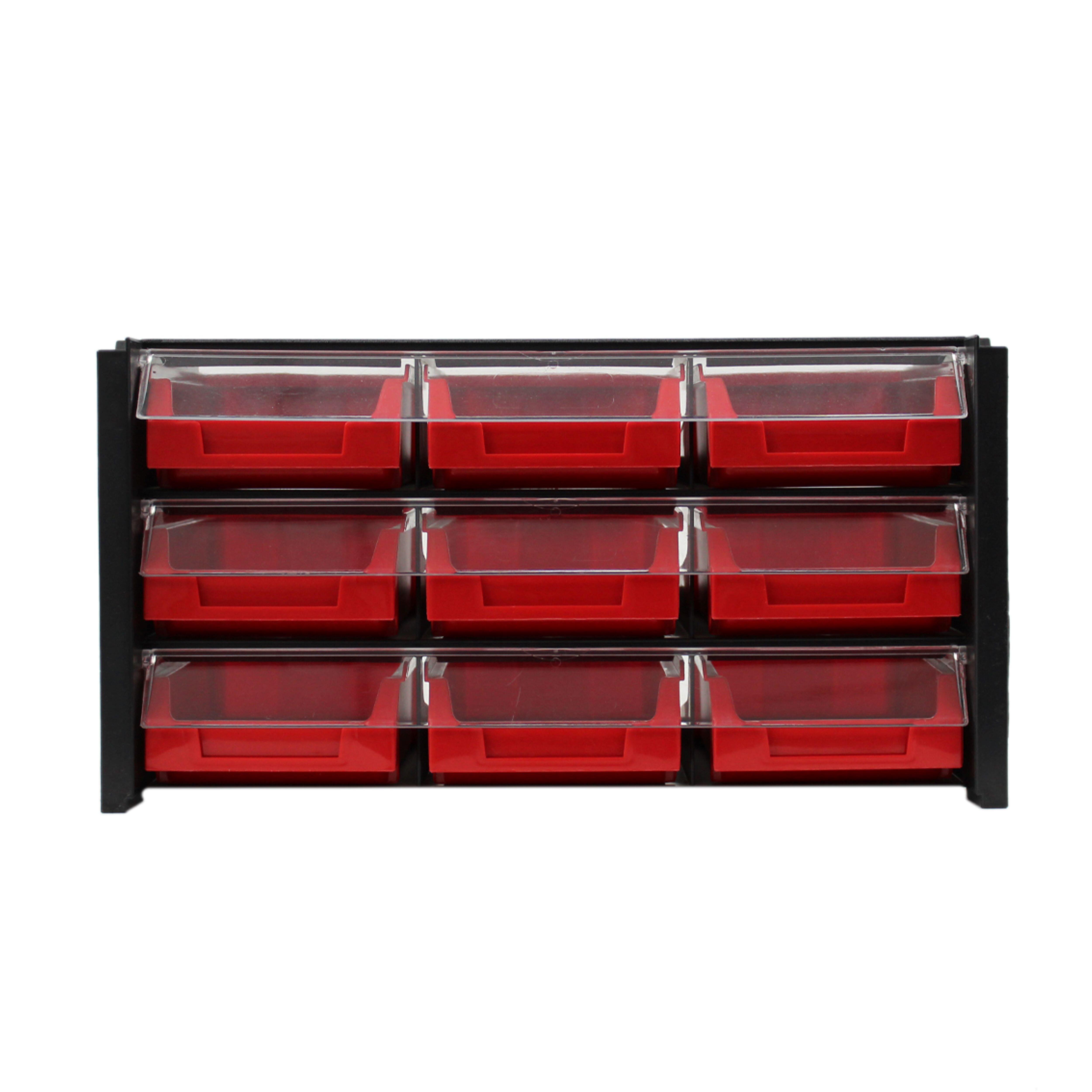 Clasificador apilable 360 x 179 x 190 mm de la marca Tayg. En polipropileno, en color negro y 9 gavetas en color rojo.