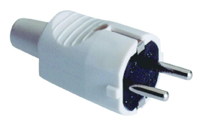 Clavija de enchufe bipolar blanca con toma de tierra lateral, material termoplástico aislante, libre de halógenos, 16A, 250V. Espiga de 4,8 ø.