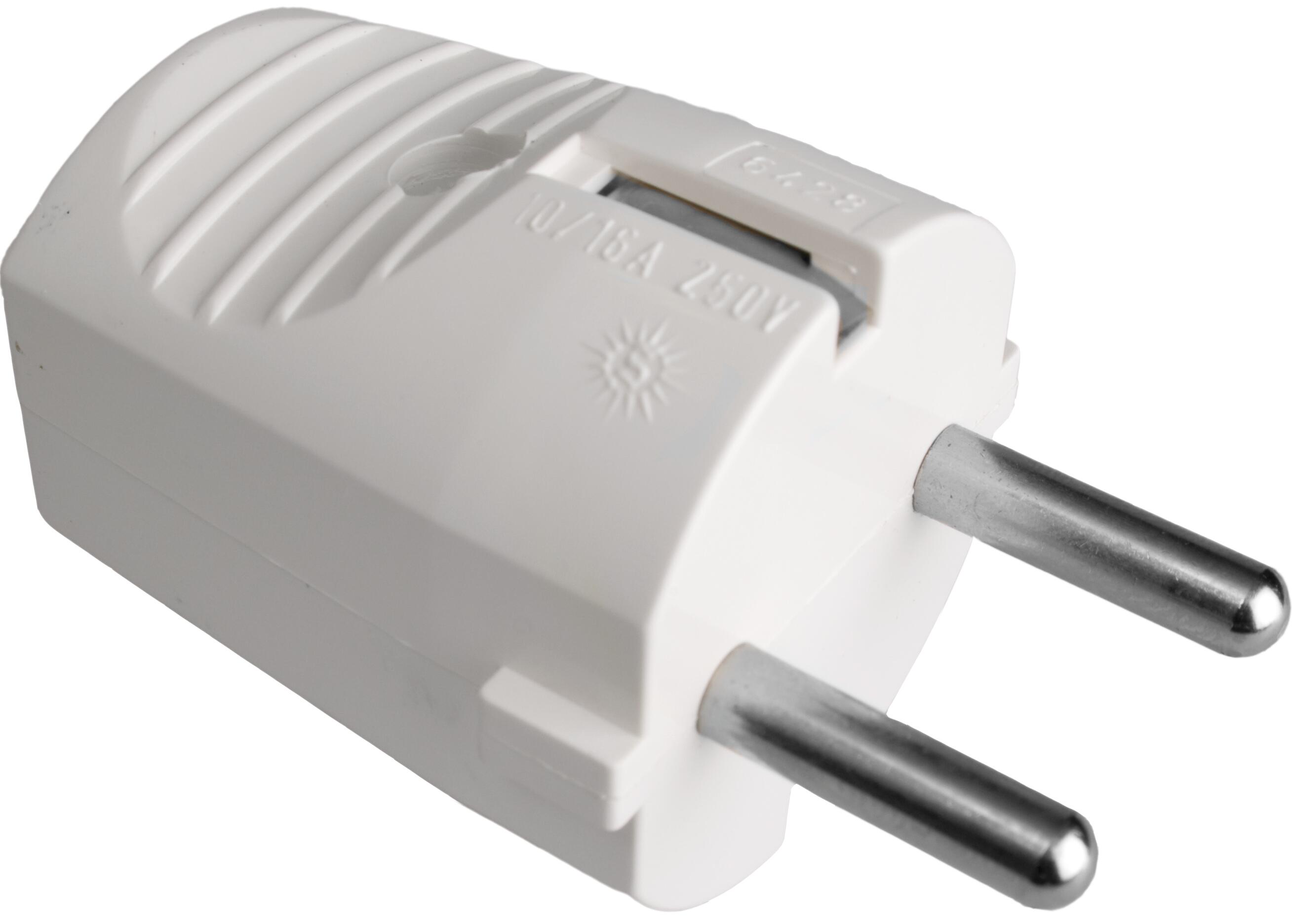 Clavija de enchufe bipolar blanco con toma de tierra lateral, 2P+T, 16A 250V. Espigas de 4,8mm de diámetro, fabricado en material termoplástico,