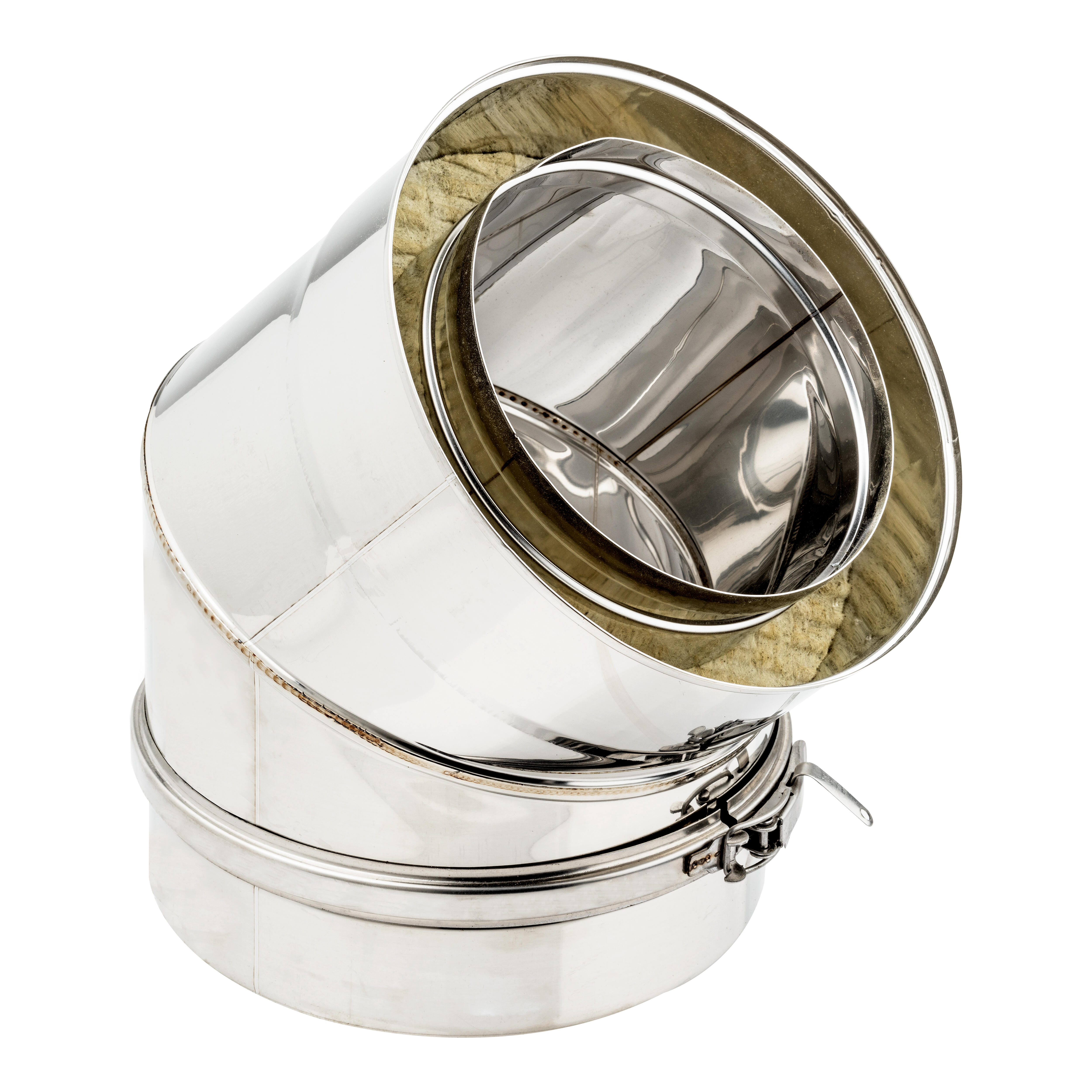 Codo 45º doble pared inoxidable 316 para la evacuación de humos de estufas de leña, inserts y hogares. Diámetro: 200 mm.
