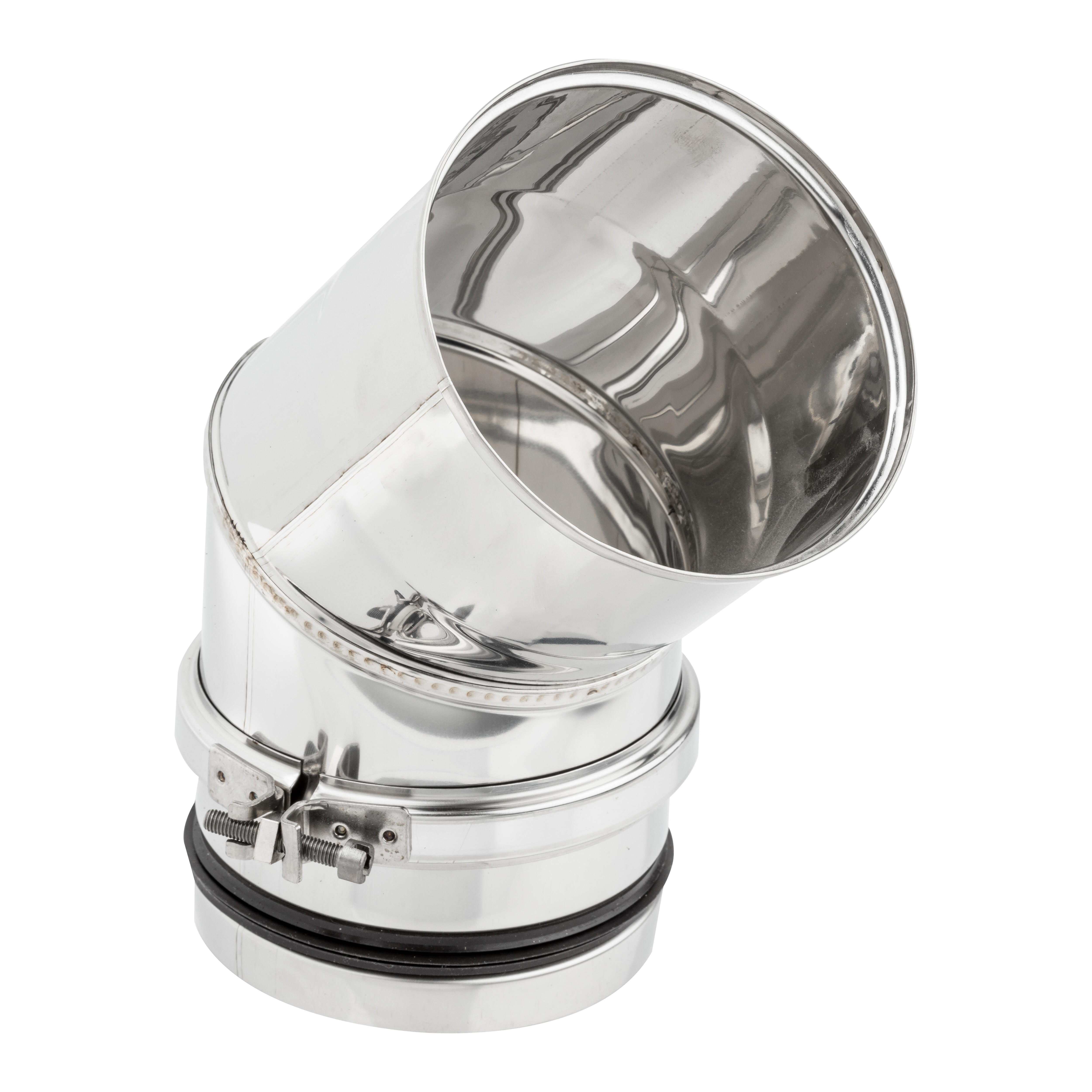 Codo 45º simple pared inoxidable 316 para la evacuación de humos de estufas de pellet. Diámetro: 100 mm.