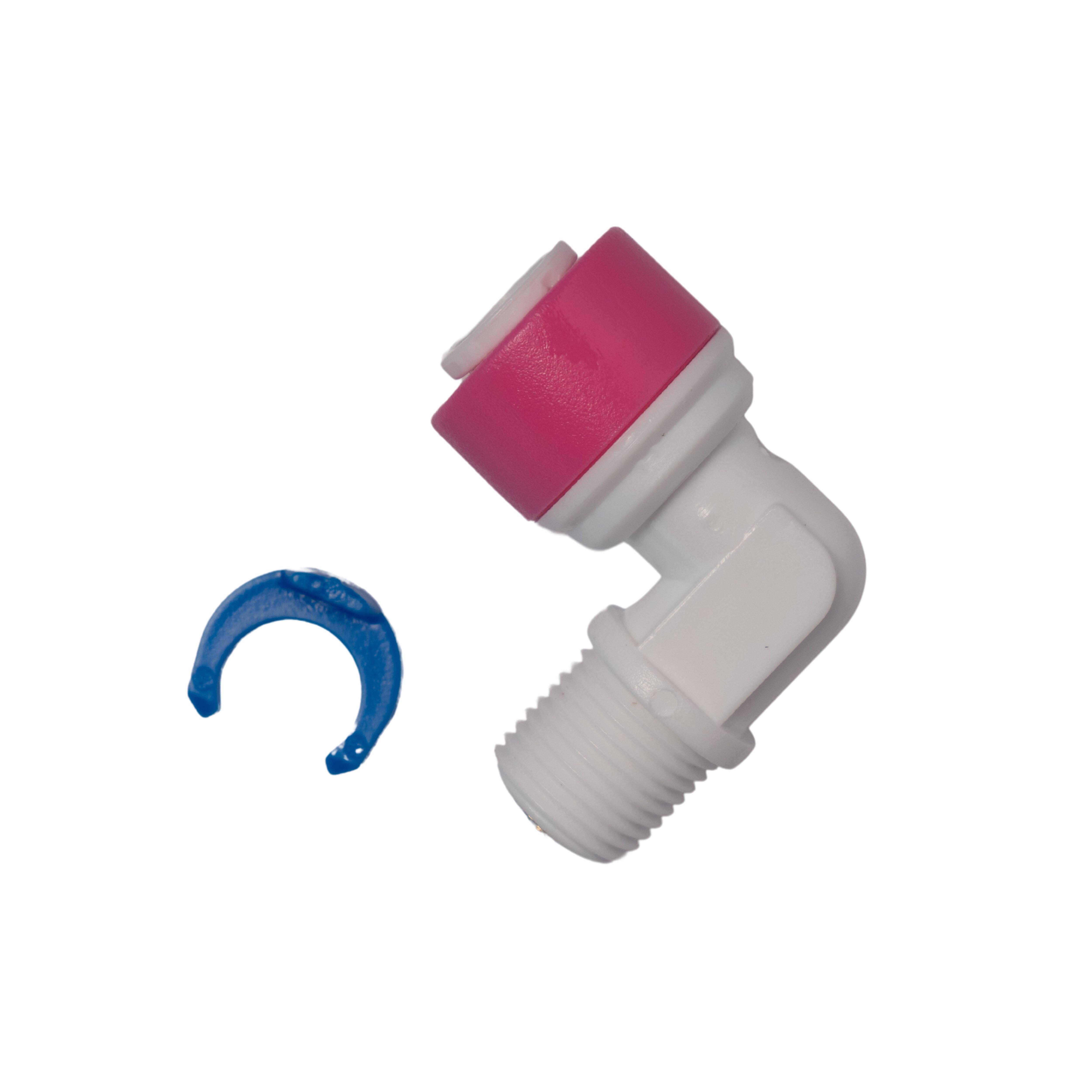 Conector en forma de codo con rosca macho para tubo 1/4" de conexión rápida.