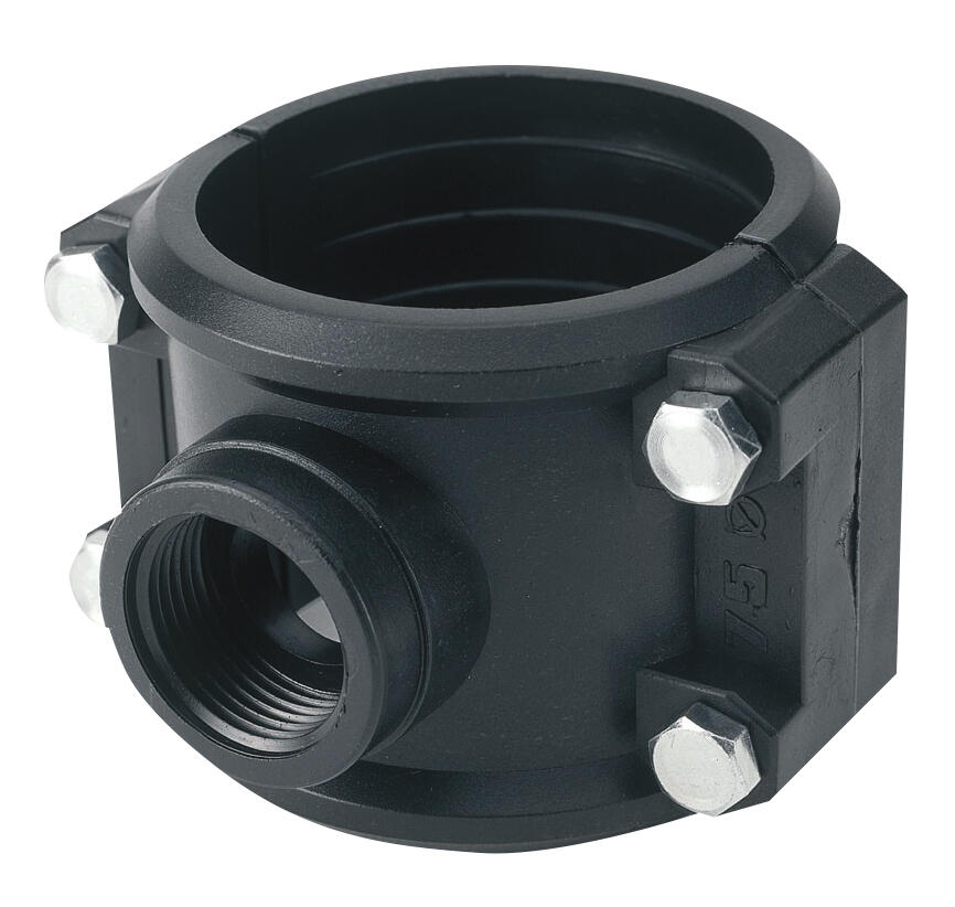 Collarín de riego utilizado para colocación de elementos de riego en tuberías de Ø32mm. Salida rosca hembra 1".