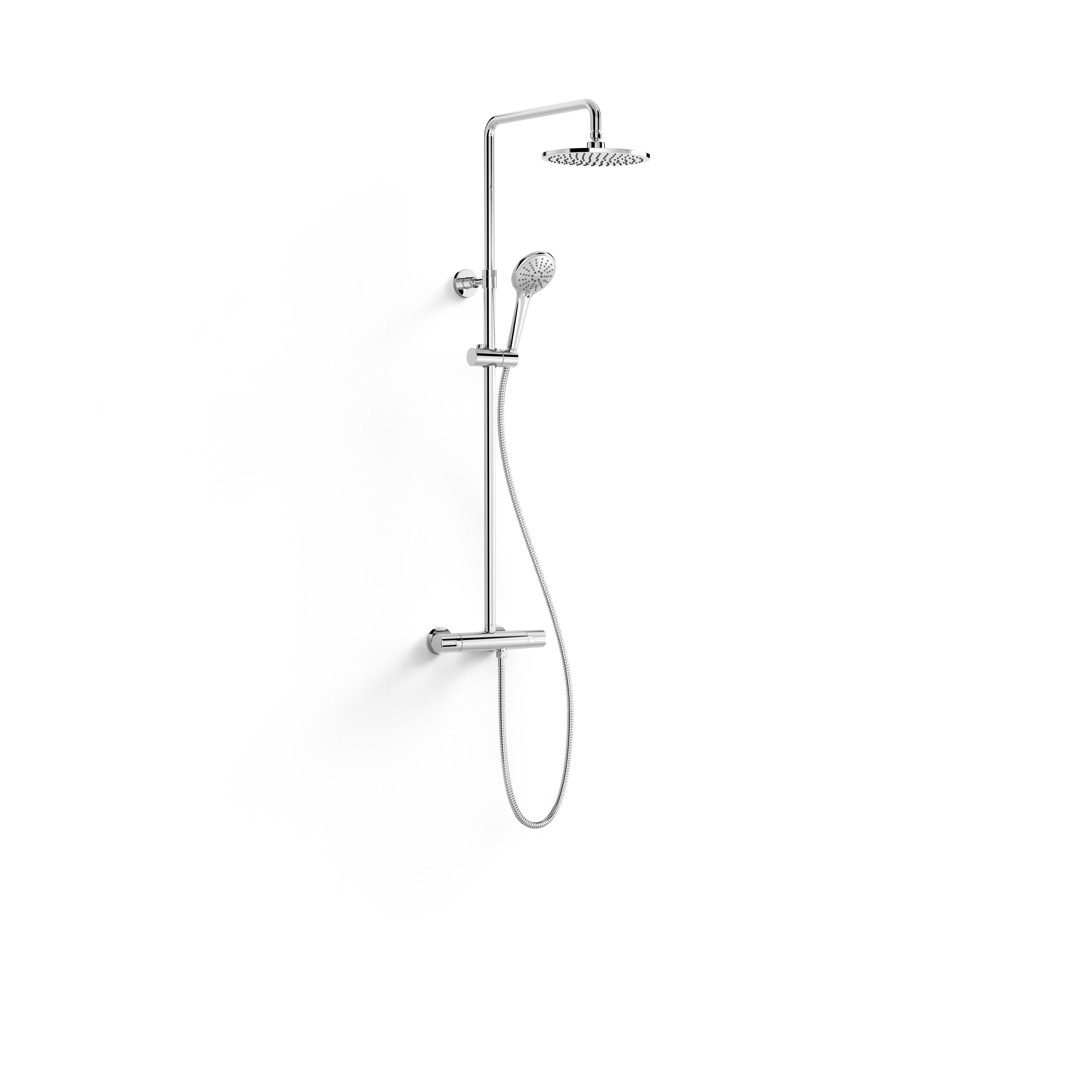 Columna de ducha con grifo monomando de la marca Tres Grifería, modelo Dual. Acabado cromado. Alto de la barra 86 a 120cm. Acero inoxidable.