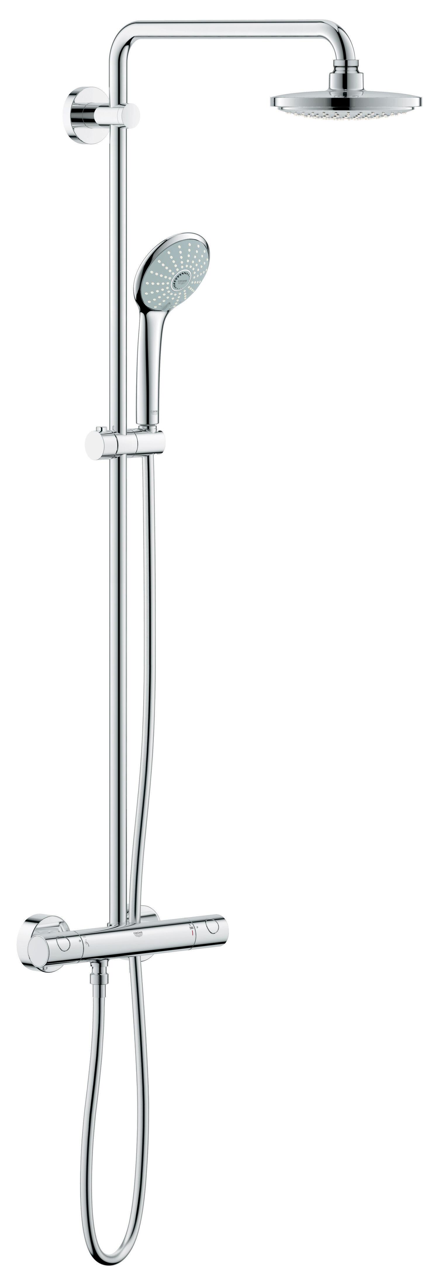 Conjuntos compuestos por duchón superior, mango, flexo y barra. Sus mangos y duchones contienen picos de silicona para que la cal no se incruste y se limpien fácilmente. Algunos de los conjuntos disponen barras regulables en altura. Caracteristicas: • brazo de ducha de proyección horizontal giratorio de 450 mm, ducha termostática expuesta con función Aquadimmer permite cambiar entre: ducha de cabeza Euphoria Cosmopolitan 180.Ducha de mano con masaje Euphoria 110,altura ajustable mediante elemento deslizante.Botón de seguridad GROHE SafeStop a 38ºC. Sistema anti-cal SpeedClean.