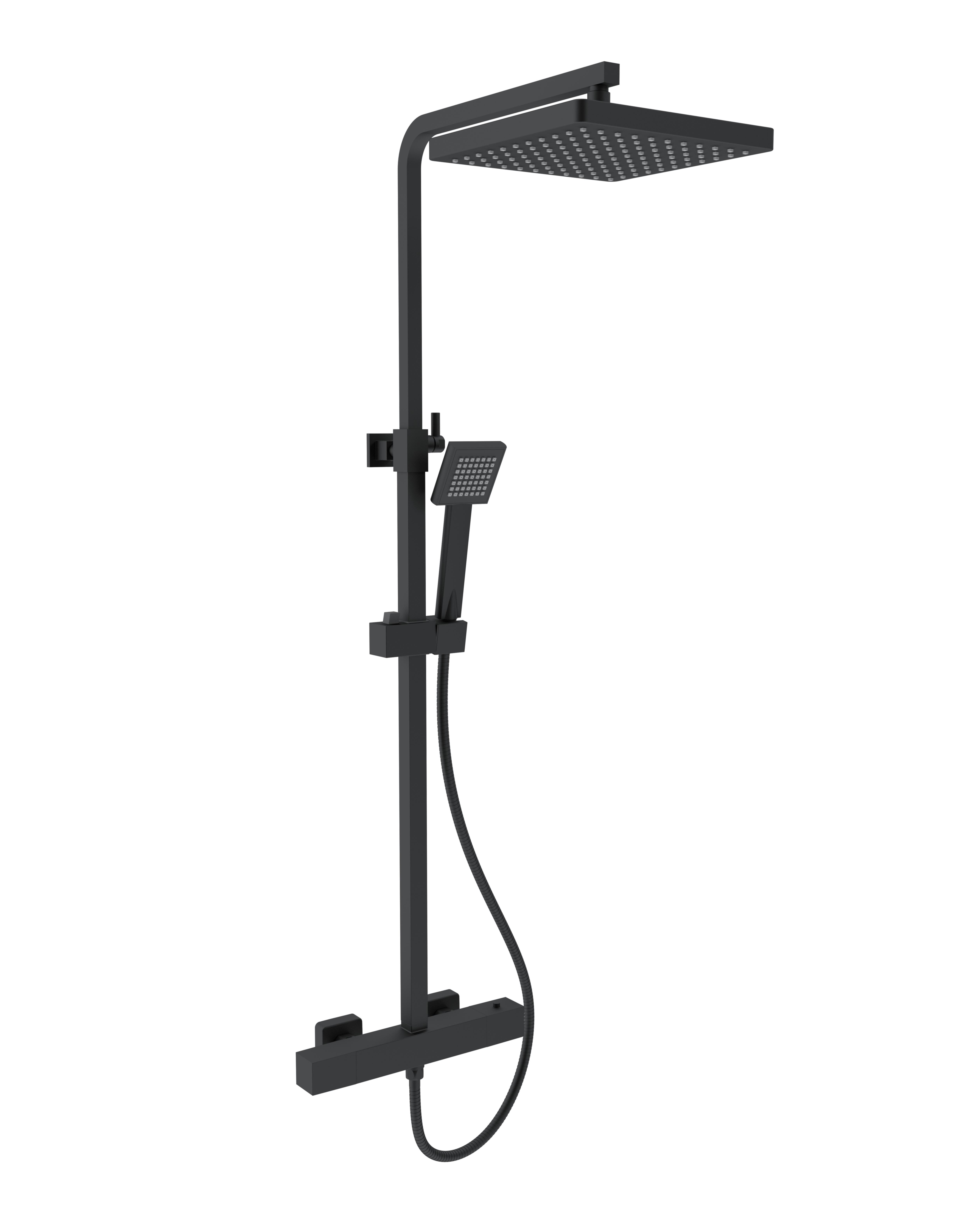 Columna de ducha termostática de la marca Teka, modelo Inca. Acabado negro. Barra extensible de 83 a 131 cm. En acero inoxidable.