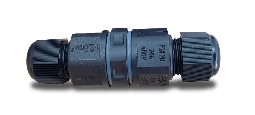 Conector IP67 para cable de 3 hilos con diametro exterior entre 5,5 y 9,5mm y sección del hilo conductor de 1 a 2,5mm2. Tensión máxima 450v y corriente máxima 24A Cubierta de Nylon y conector de cobre.