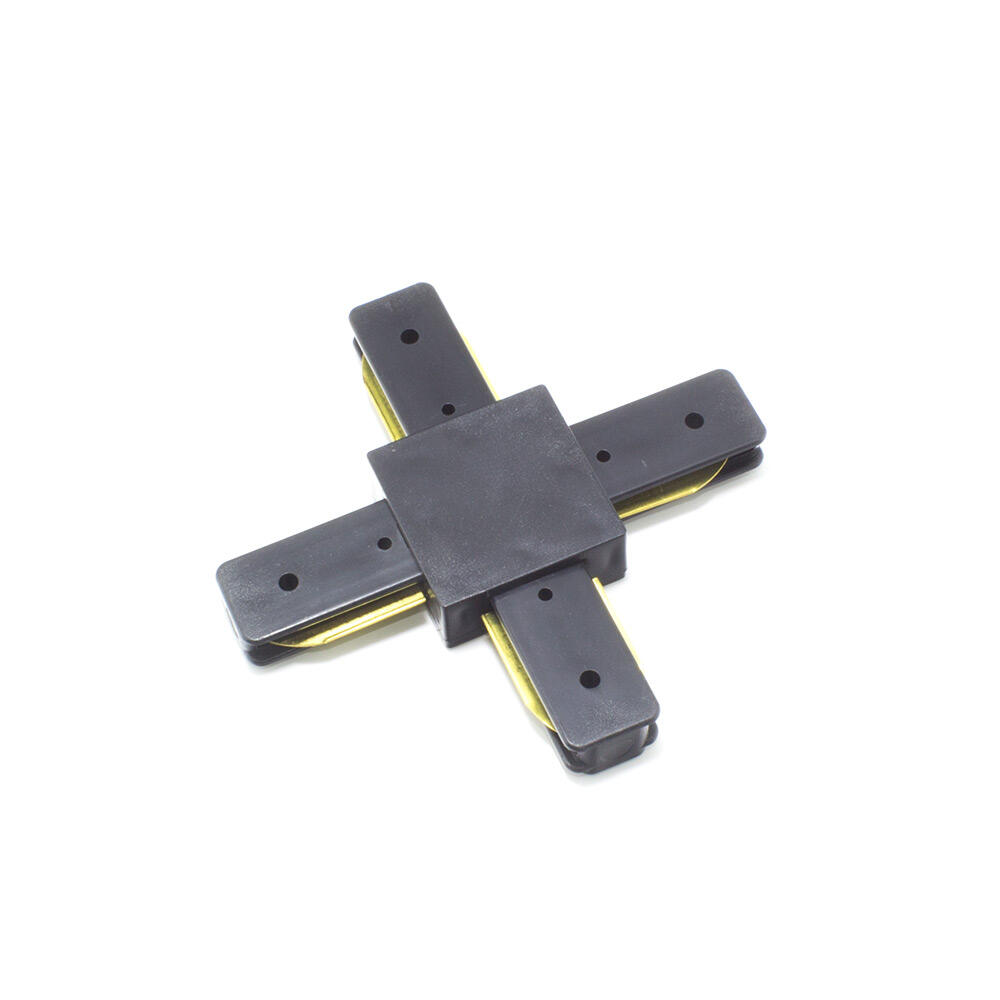 Conector tipo x para Carril monofásico reforzado. permite crear una unión de 4 carriles y a su vez traspasar la energía entre ellos.