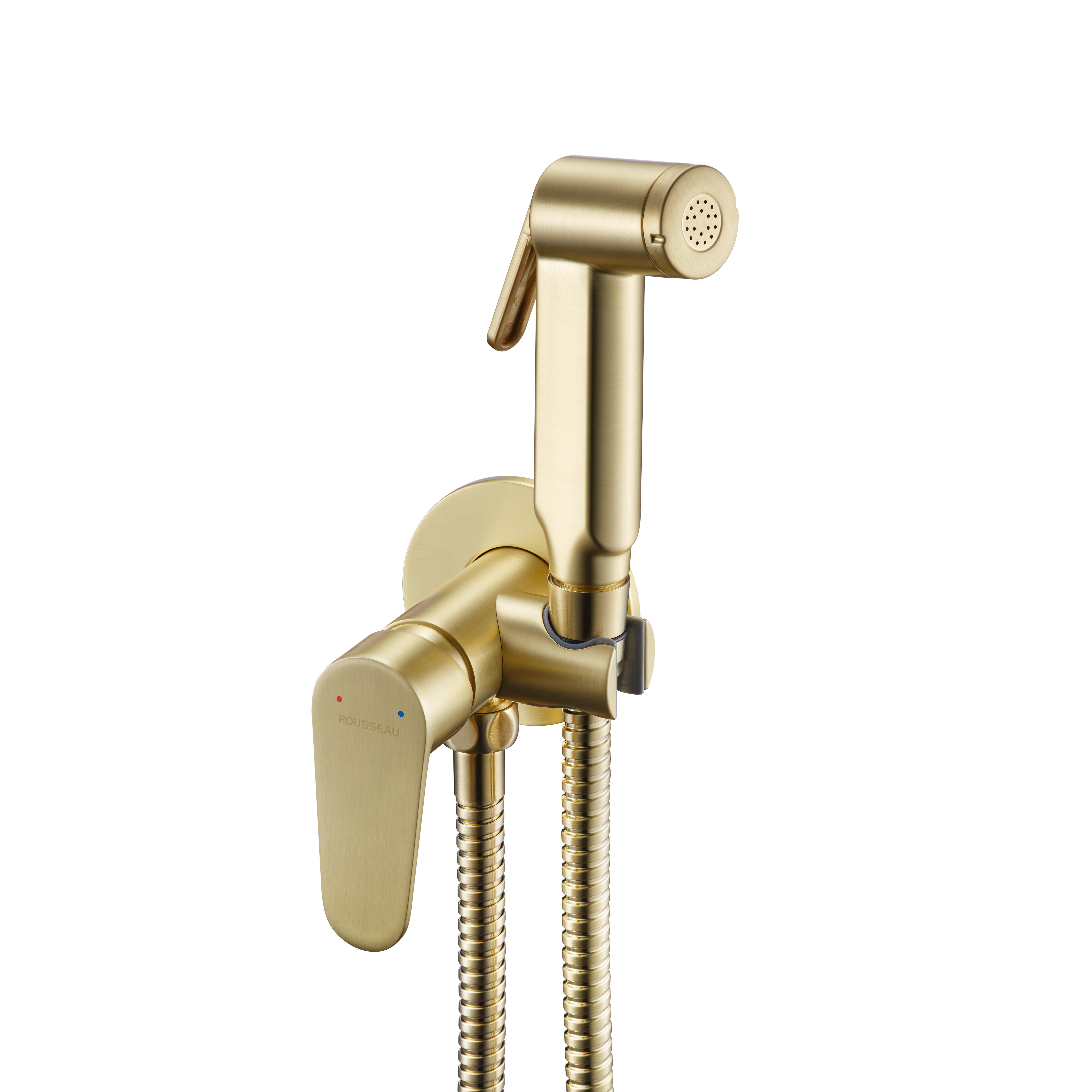 Grifo de pared monomando, sustitución de bidé, a 2 aguas, en color oro cepillado, con acabado PVD, para empotrar.