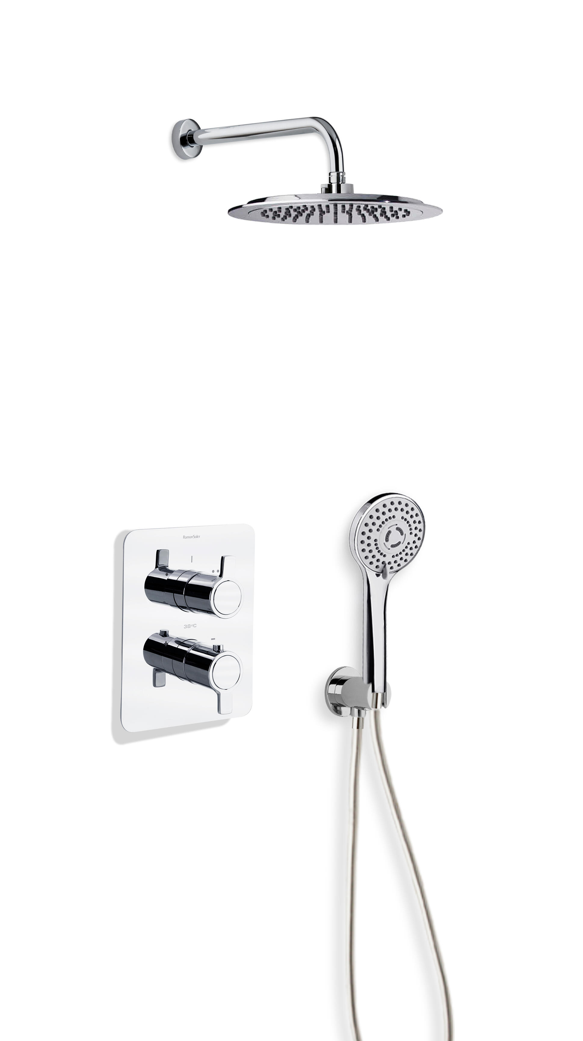 Conjuntos compuestos de rociador, mango, flexo, y monomando. Estos conjuntos son empotrados, permitiendo tener en su baño un diseño sencillo y sofisticado Sus mangos contienen picos de silicona para que la cal no se incruste y se limpien fácilmente.
