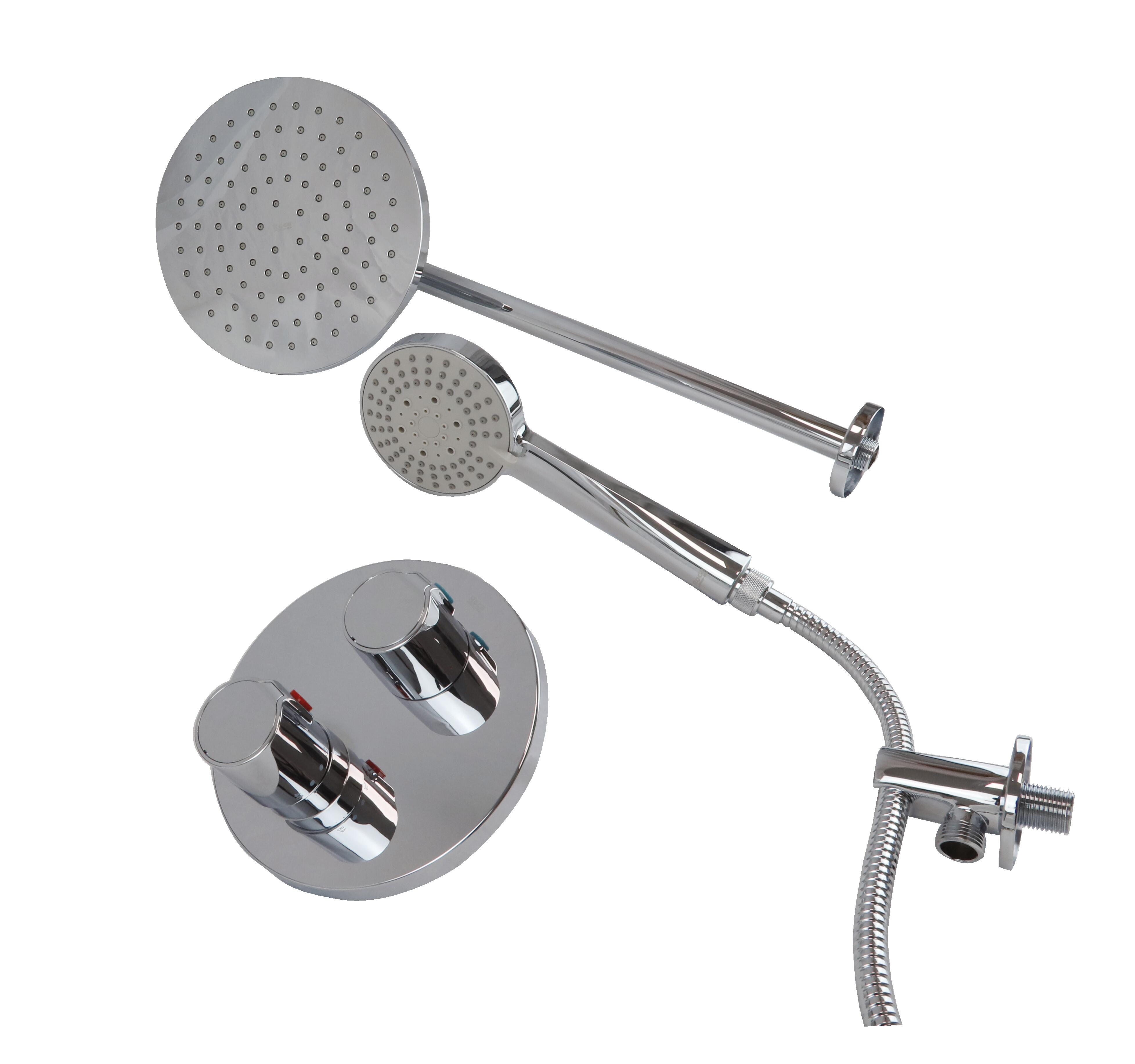 Conjuntos compuestos de rociador, mango, flexo, y monomando. Estos conjuntos son empotrados, permitiendo tener en su baño un diseño sencillo y sofisticado Sus mangos contienen picos de silicona para que la cal no se incruste y se limpien fácilmente. Además este grifo es termostático lo que evita quemaduras gracias a su botón de seguridad ( 38º)