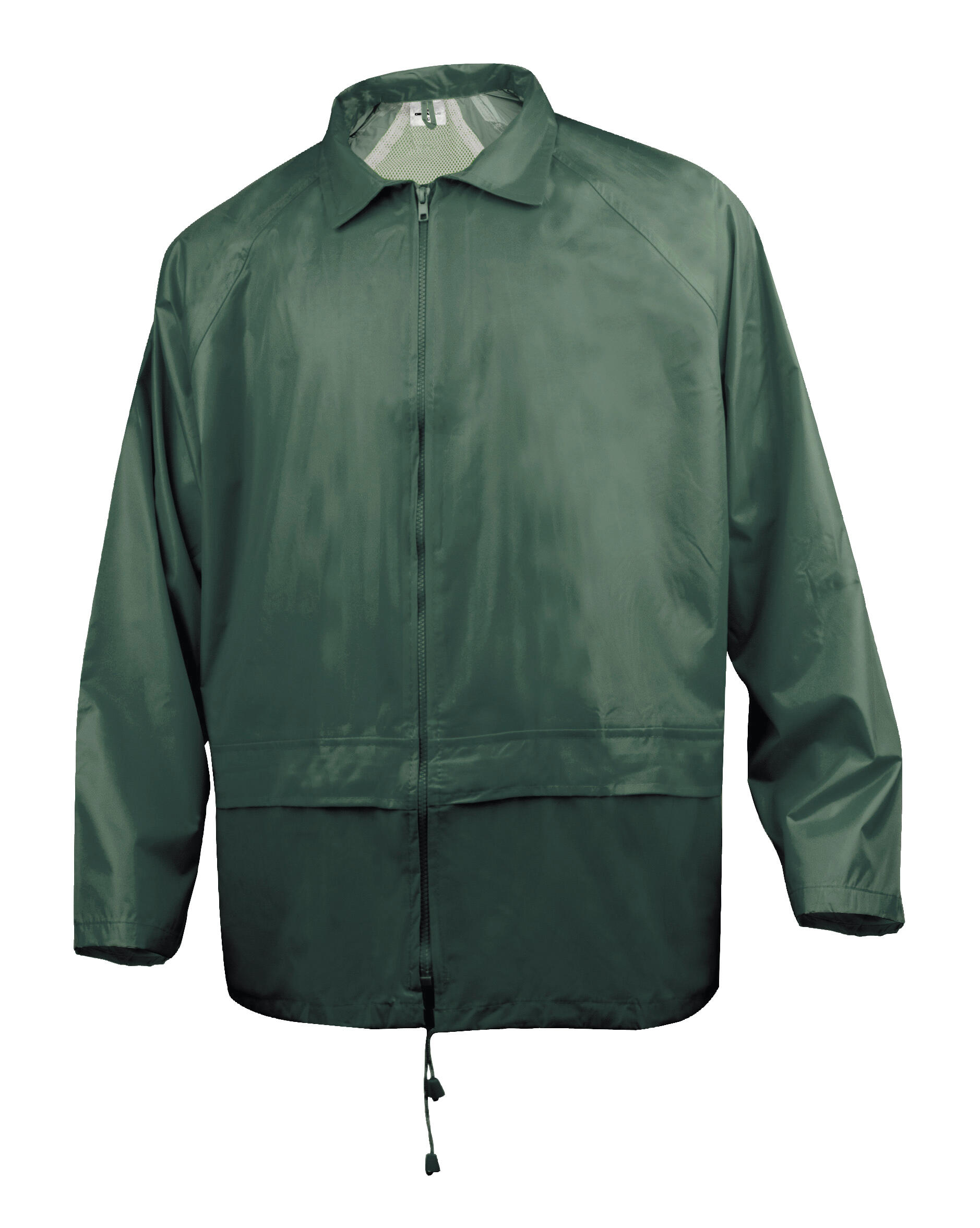 Conjunto de lluvia chaqueta y pantalón poliéster impregnado de PVC. Costuras termoselladas. Chaqueta: Capucha fija. Cierre por cremallera antifrío. Mangas raglán. Puños ajustables con corchetes. 2 bolsillos. Pantalón: Cintura elástica. Bajo de piernas ajustado con corchetes. Color verde.