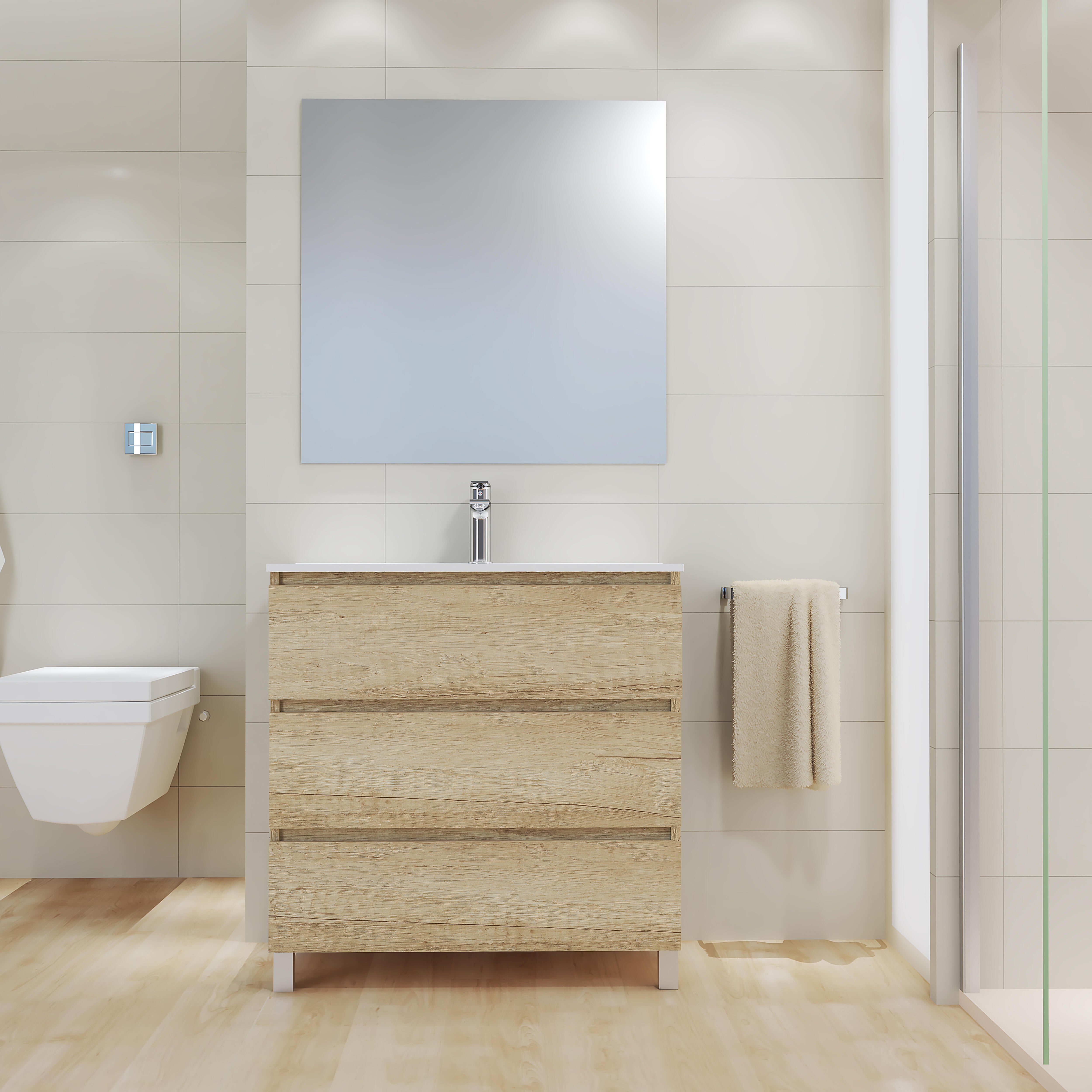Conjunto mueble de baño, modelo Ana. En color roble. Medidas 80x46cm. Distribución de 3 cajones.