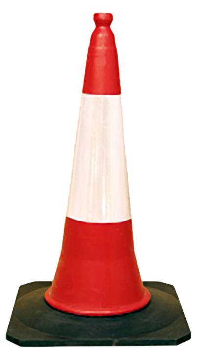 Cono fabricado en dos piezas ensambladas, desmontables ante posibles impactos y de alta estabilidad. La parte superior es de polietileno y la base de caucho recliclado en negro. La parte superior conica en color blanco y rojo. Reflectante.