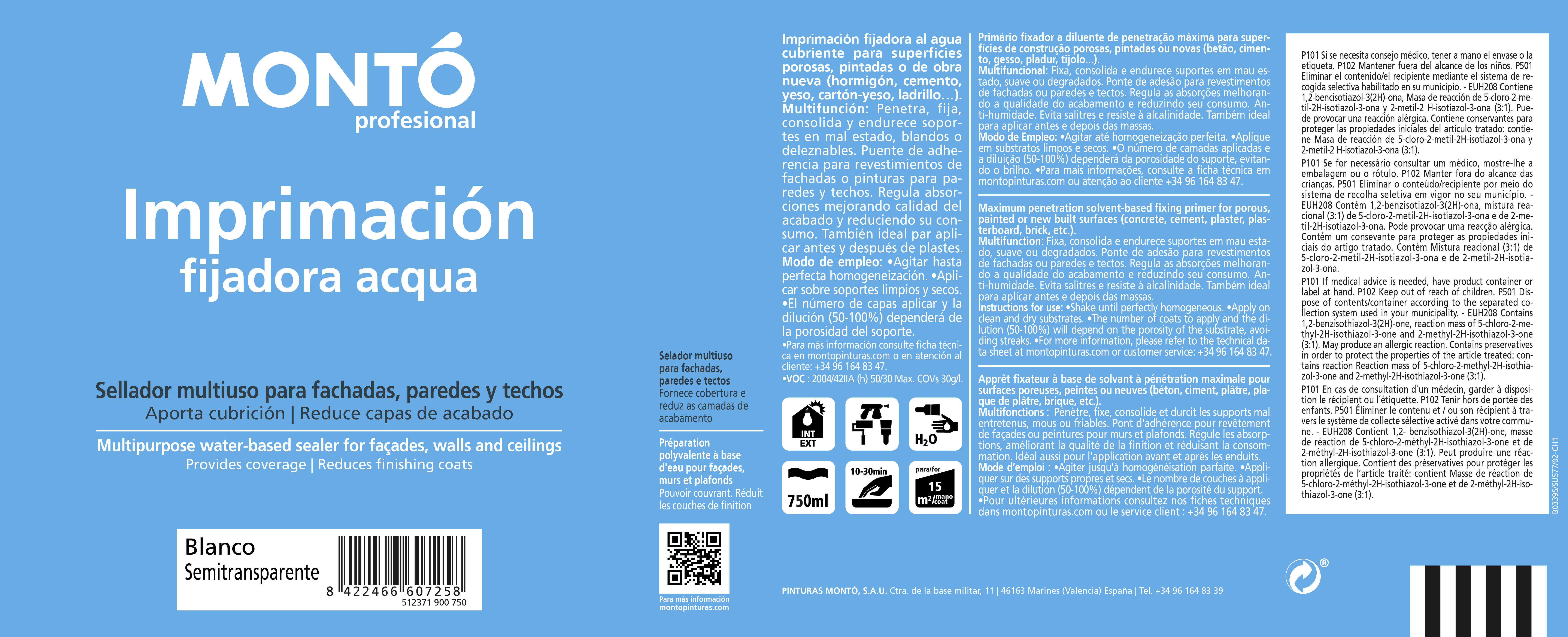Imprimación fijadora al agua cubriente para superficies porosas, pintadas o de obra nueva ( hormigón, cemento, yeso, cartón-yeso, ladrillo,…). Actúa como puente de adherencia para revestimientos de fachadas o pinturas para paredes y techos. En soportes en mal estado o blandos, penetra, fija, consolida y endurece. * Rendimiento: 15-25 m2/l * Secado al tacto: 10-30 minutos * Repintado: 4 horas