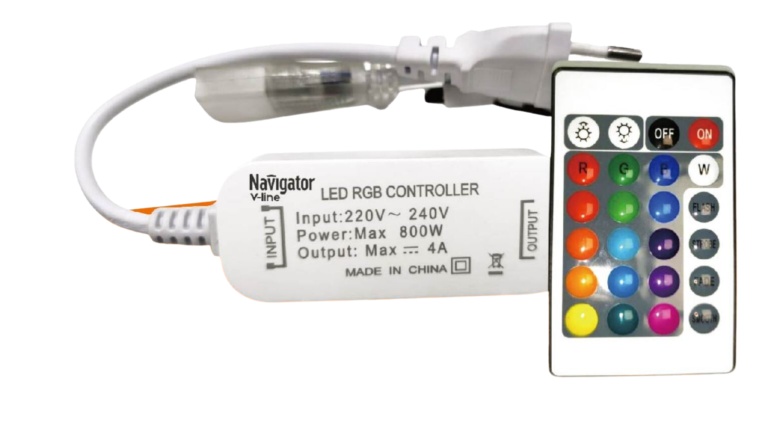 Controlador RGB con mando (red, green, blue) para tira led de 230V. Potencia nominal de 800W. Distancia máxima de control hasta 25m.