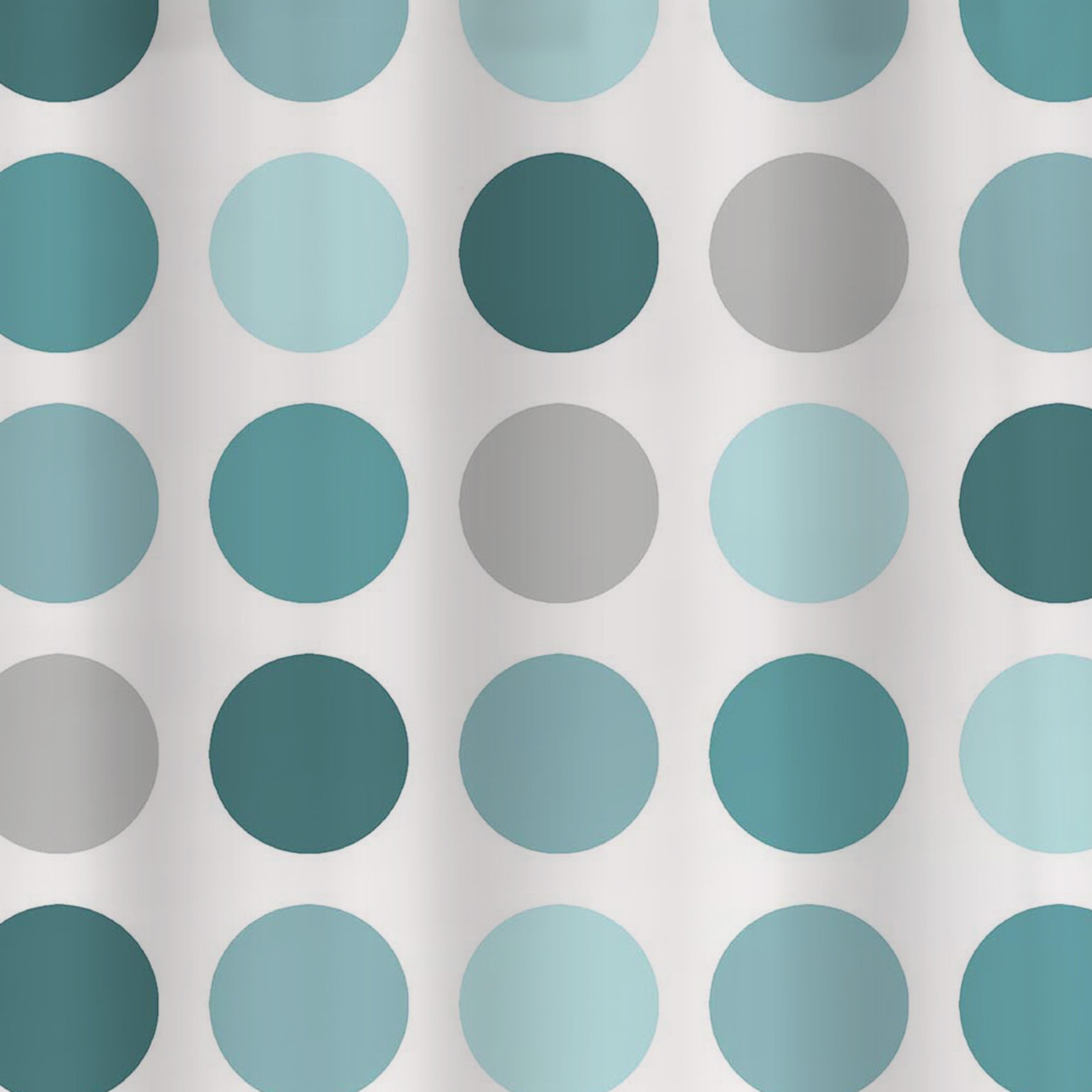 Cortina de baño en PVC con dibujo de puntos. Barra y anillas no incluidas. Medidas 180x220cm. Fácil limpieza.