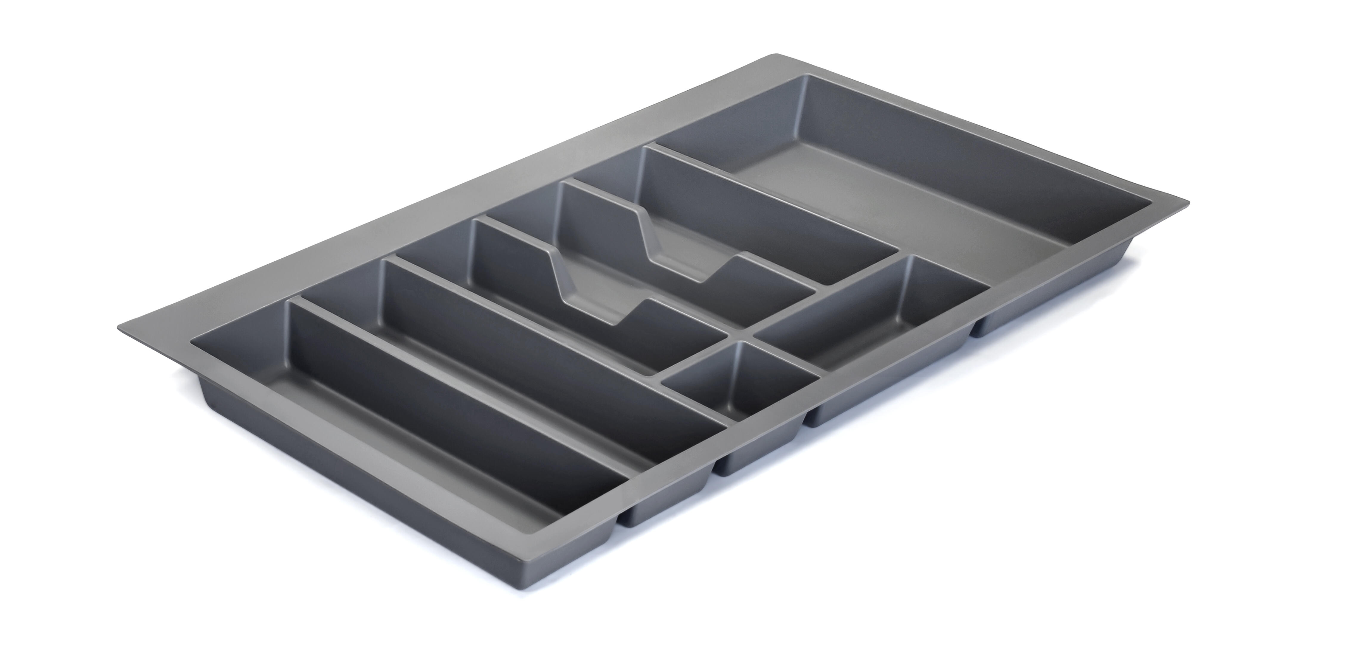 Cubertero para interior de cajón para mueble de 80 cm. Fabricado en polipropileno en color grafito. Tiene 8 compartimentos para organizar los utensilios de cocina.