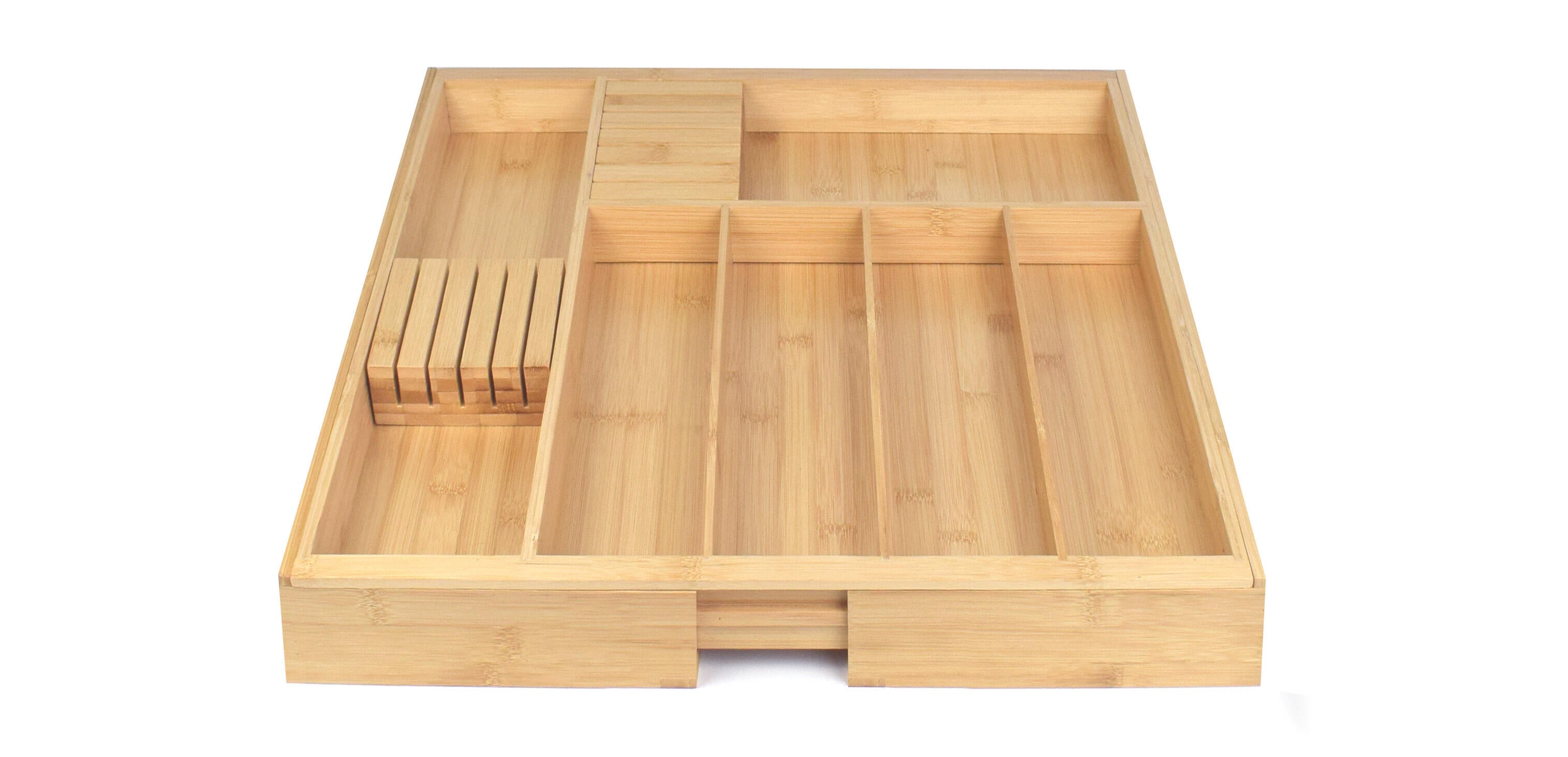 Cuenta con un diseño extensible y deslizante, lo que permite ajustarlo fácilmente a casi cualquier cajón, adaptándose a diferentes anchos sin perder estabilidad. Su estructura incorpora entre 6 y 8 compartimentos, con ranuras más anchas que facilitan la colocación cómoda de cubiertos y utensilios de mayor tamaño.