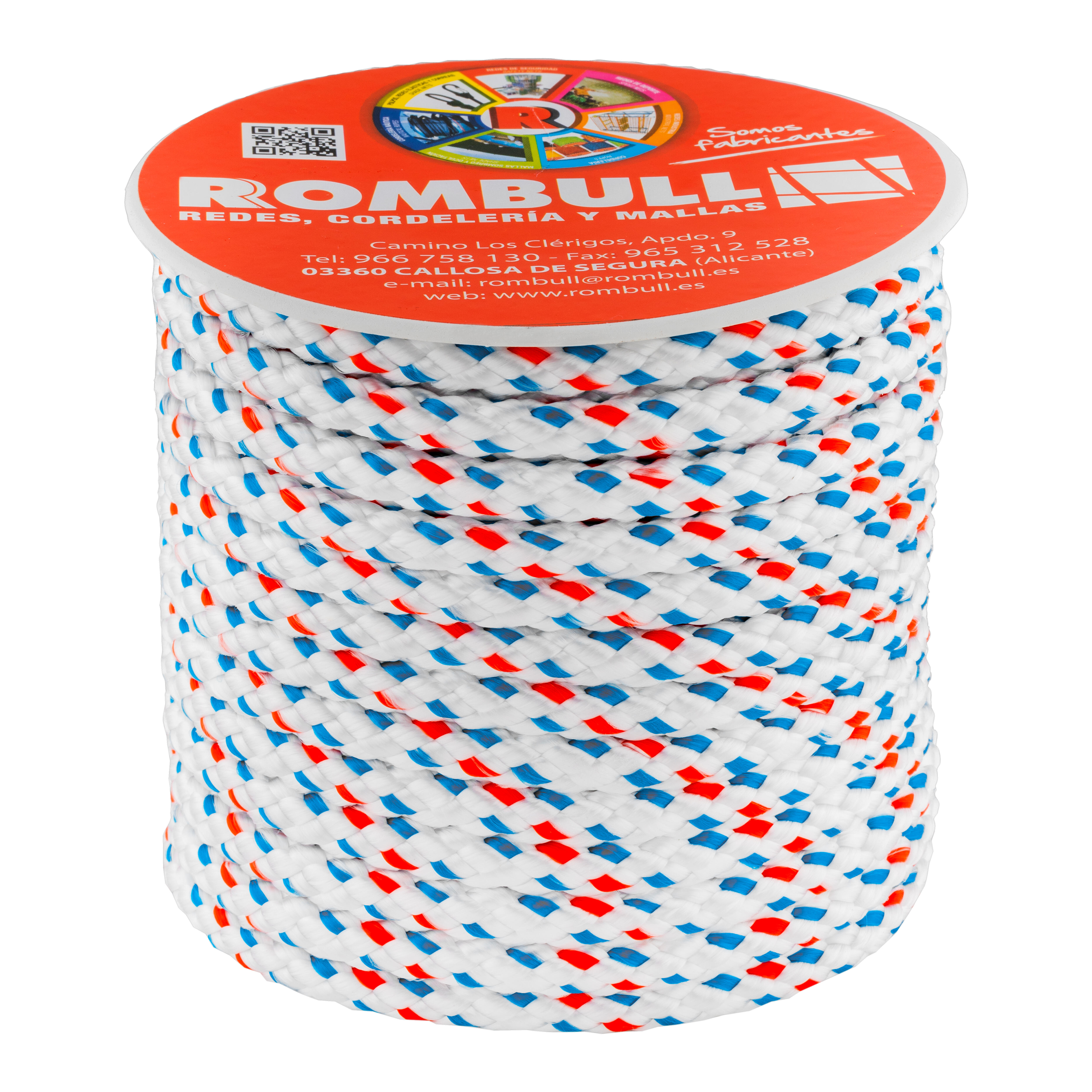 Cuerda poliéster trenzada 8mm 18m blanca con pintas azul y naranja ROMBULL.