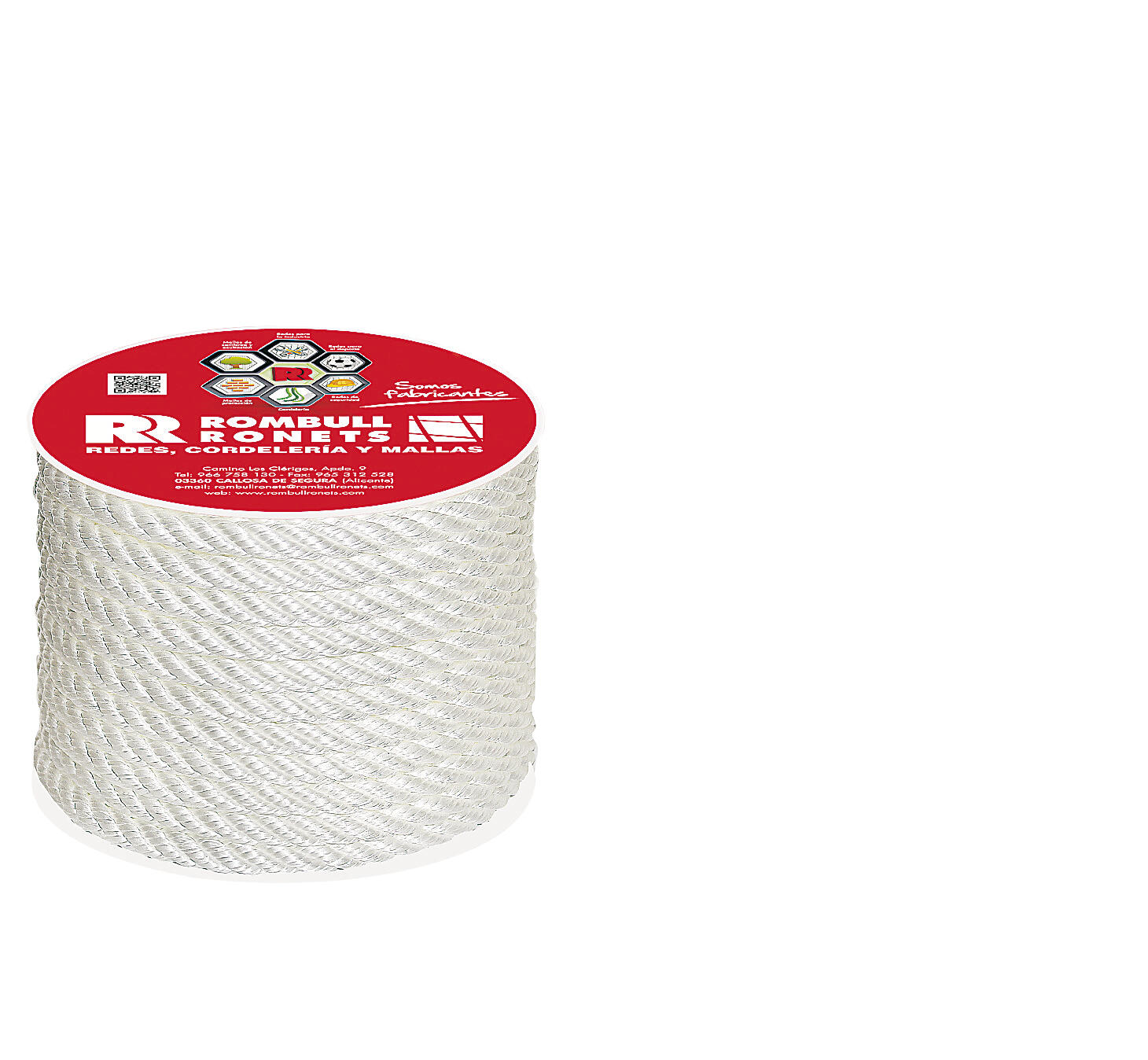 Cuerda polipropileno cableada, grosor de 10mm y longitud de 14m en color blanco, de la marca Rombull.