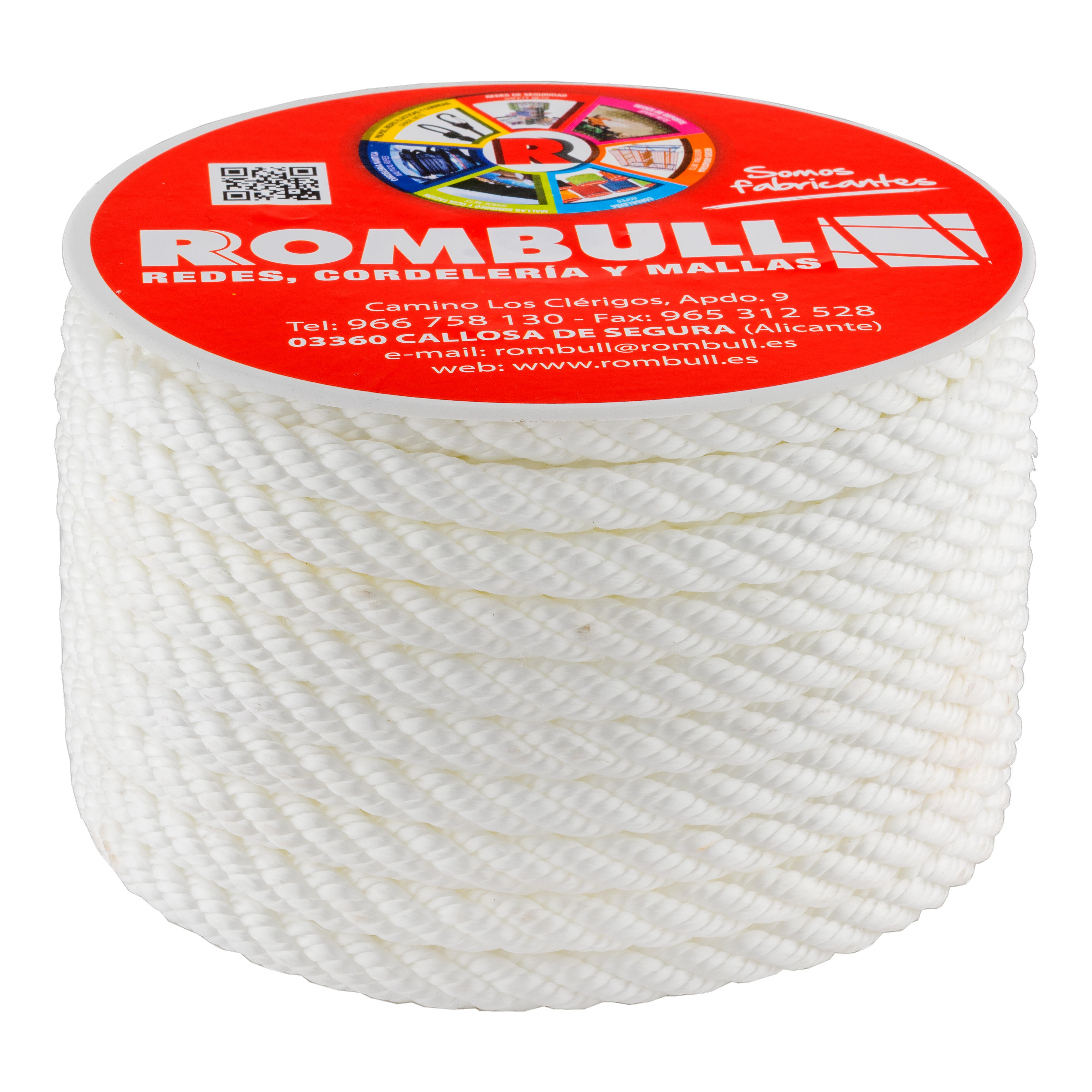 Cuerda polipropileno cableada, grosor de 10mm y longitud de 23m en color blanco, de la marca Rombull.