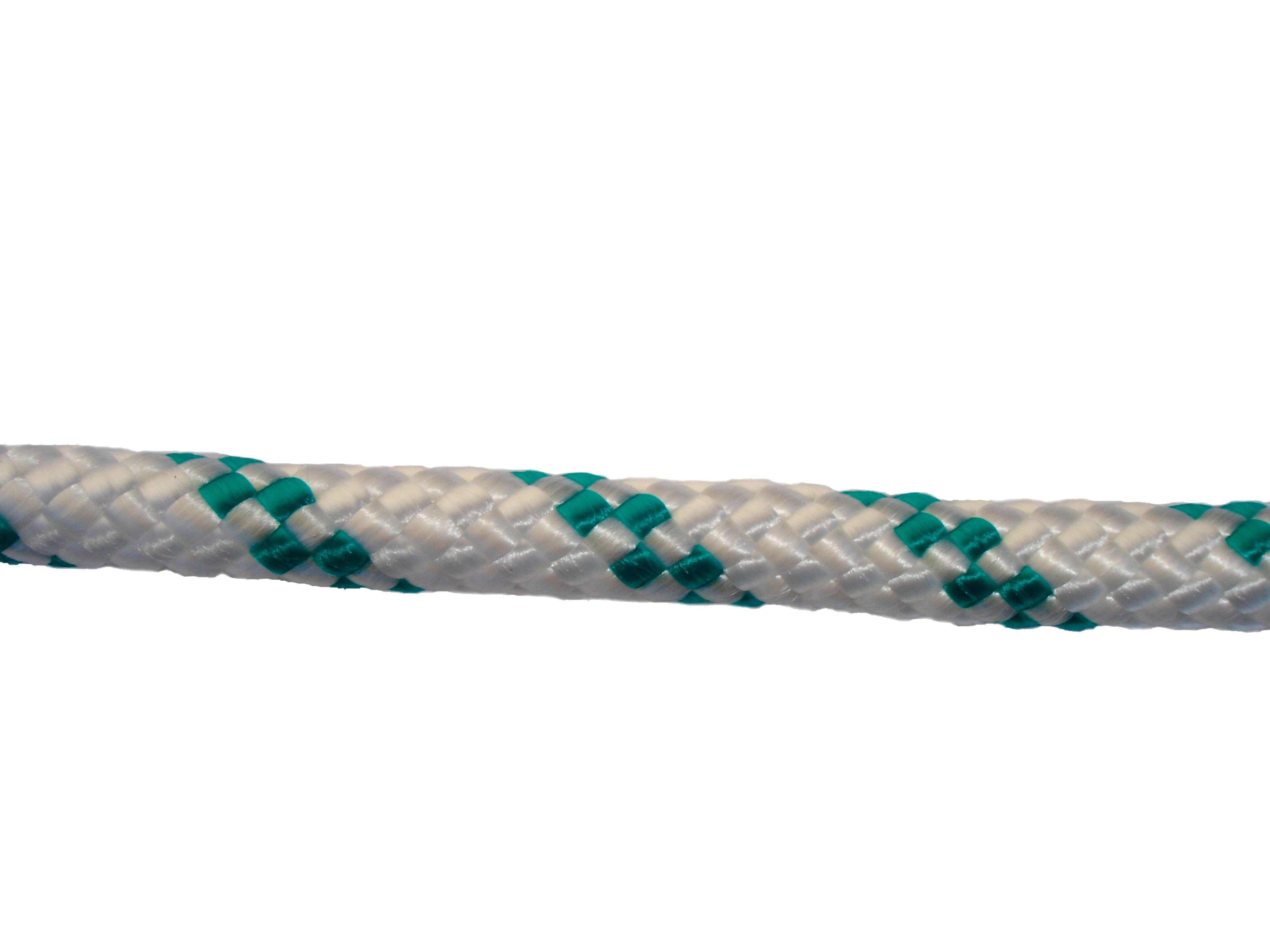 CUERDA POLIPROPILENO TRENZADA CON ALMA 8MM. 1M BLANCA CON PINTAS VERDES ROMBULL