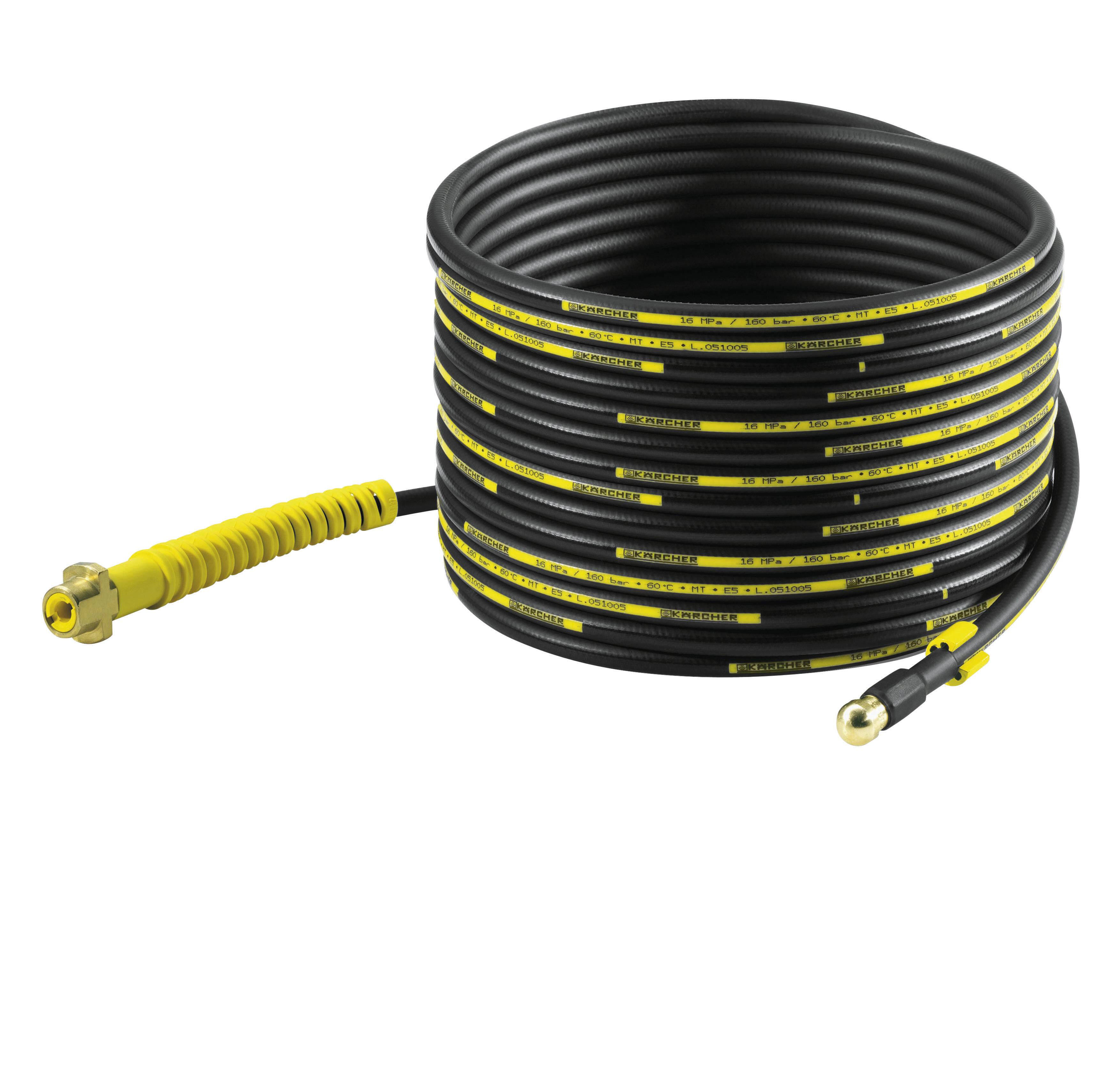 Cuatro chorros de alta presión orientados hacia atrás desplazan la manguera por la tubería deshaciendo el atasco. Una marca continua y un anillo de marcación señalan la posición dentro de la tubería. Esta flexible manguera de 15 m está reforzada con trenzado textil y cuenta con una boquilla de latón extracorta para una óptima movilidad dentro de la tubería. La manguera cuenta, además, con protección contra flexiones y conexión de latón para una larga vida útil. Adecuado para utilizar en casa y en exteriores con todas las limpiadoras de alta presión Consumer de Kärcher de las clases K2-K7.