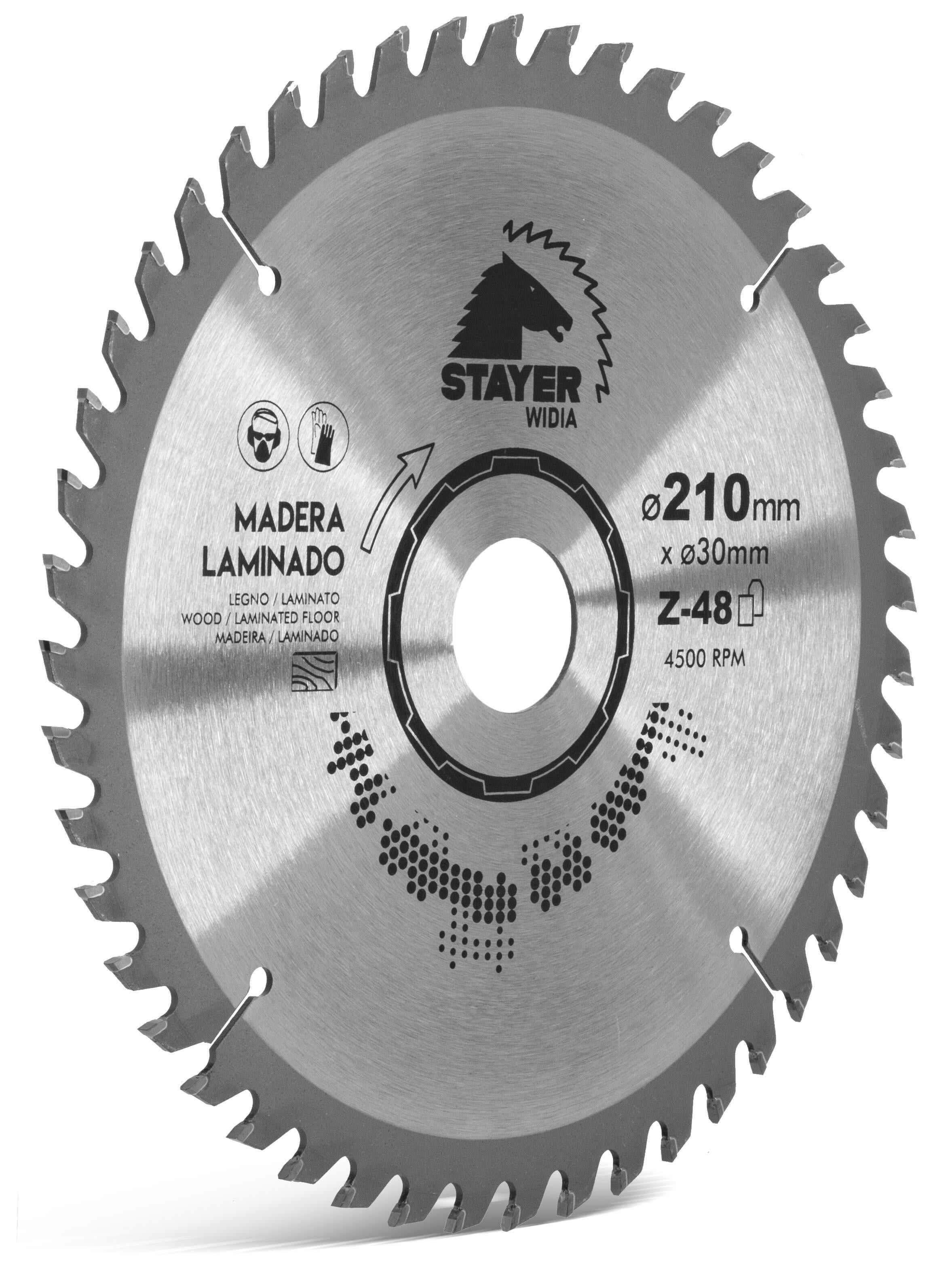 Disco de widia corte laminados fino 190mm Z48 Stayer. Aplicación universal en madera blanda y dura, tablas de virutas prensadas, materiales compuestos, materiales de tablero sensibles o con un recubrimiento fino, tableros de varias chapas, madera contrachapada, materiales compuestos de fibras y MDF.